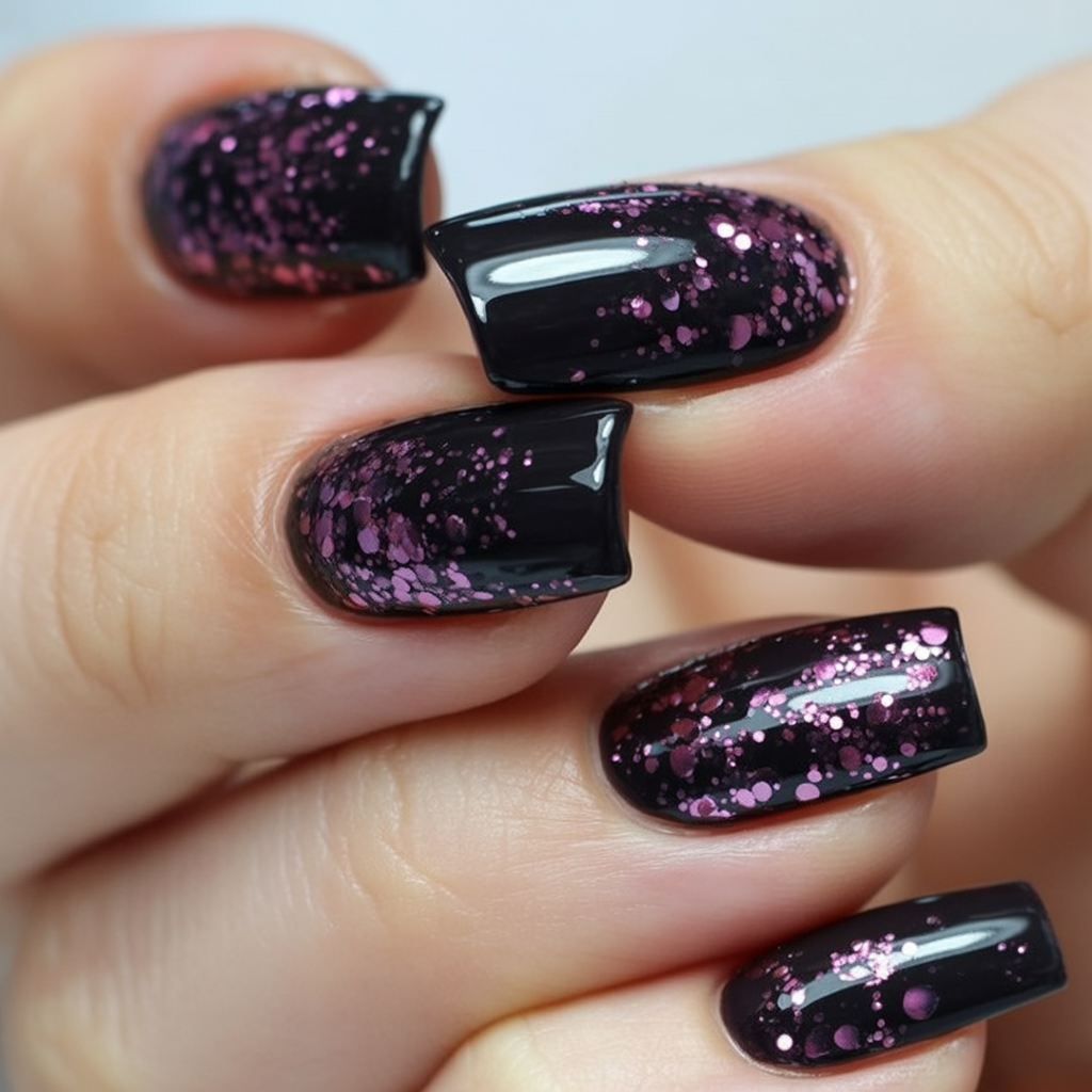 Dark and moody with a sprinkle of playful pink, this look feels like stepping into a January night where the stars burn brighter than usual. The scattered glitter has a cosmic feel, bringing a mysterious yet fun touch that keeps the look from being too serious.