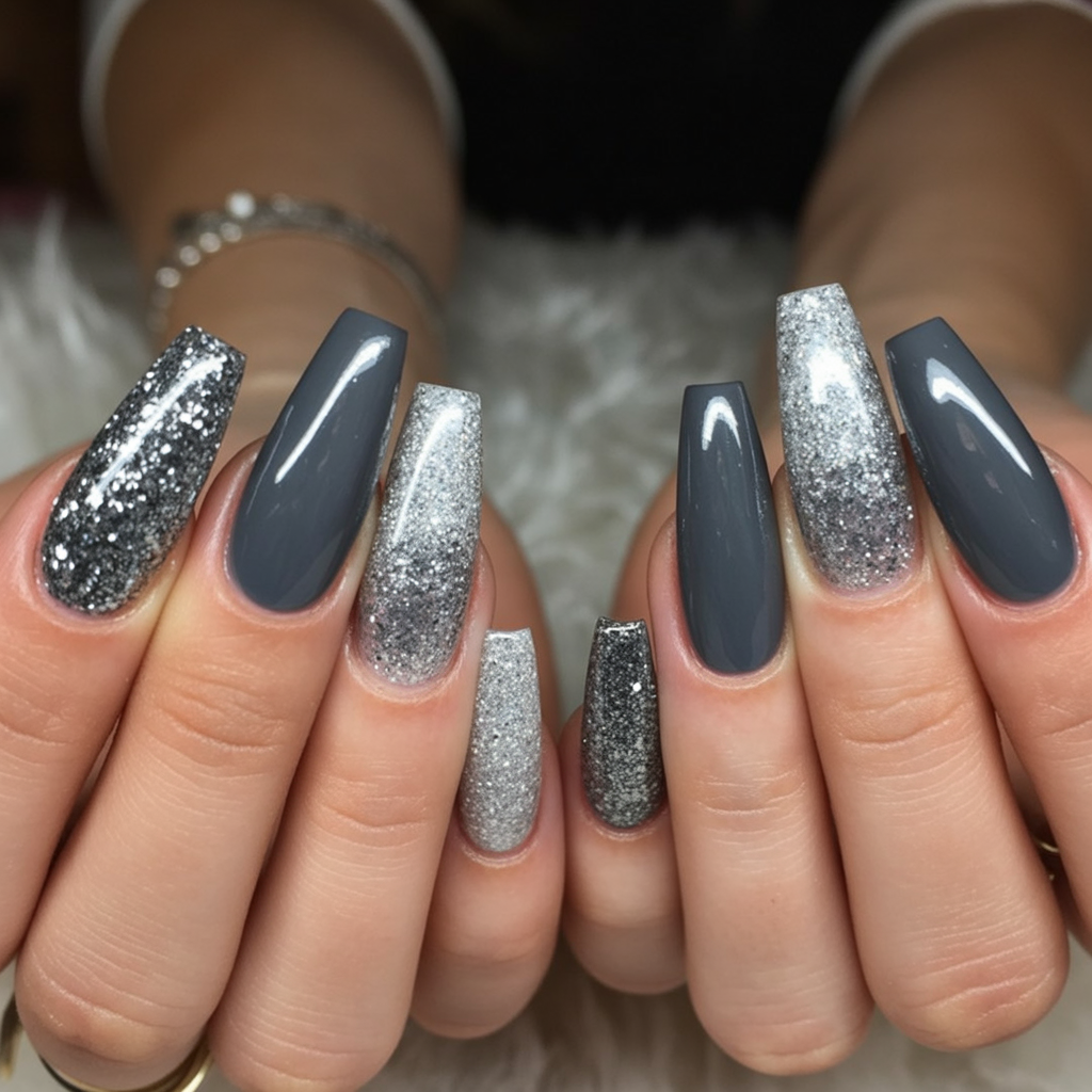 If January had a signature look, this smoky gray and glitter mix would be it—moody, cool, and sprinkled with sparkle like frost on a windowpane. The long shape brings a dramatic edge, making your hands look instantly more refined and powerful. It’s a manicure that doesn’t whisper—it announces itself.