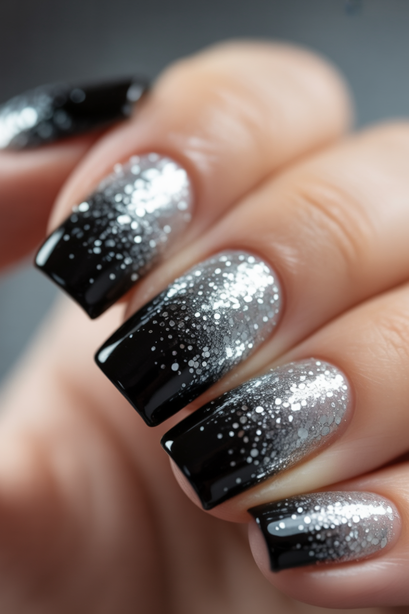 Like fresh snow falling into midnight, this manicure is all about contrast. The black base makes the silver glitter pop, creating a fading stardust effect that feels endlessly chic. It’s a look that feels dramatic yet wearable, perfect for winter nights.