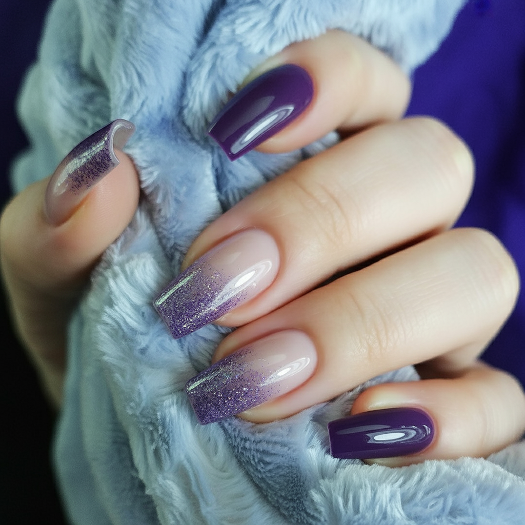 The soft purple colors fading into earthy tones create a dreamy effect that feels like a mix of magic and achieveability. The shimmer is as if snow on the windowpane, very delicate and light. This is the kind of manicure that gets you warm and comfortable while looking good with hardly any effort, just right for those who want to wear something with a classy but discreet touch.