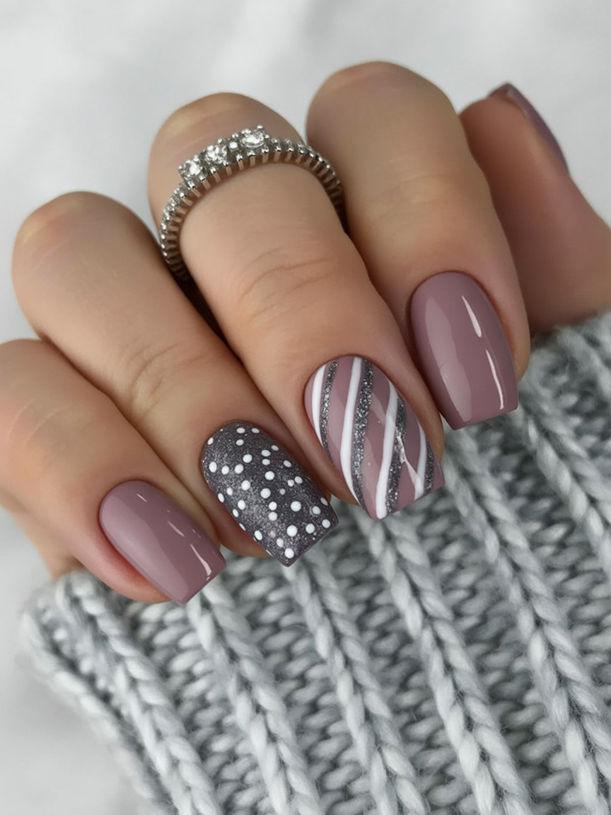 The neutral mauve with a perfect finish becoming is like wrapping yourself in your favorite cashmere sweater. The playful stripes and polka dots are simple and fun-making a cheerful winter touch. It’s relaxed but still has a polished look; it is a type of manicure that says “effortless style” while it still receives compliments.