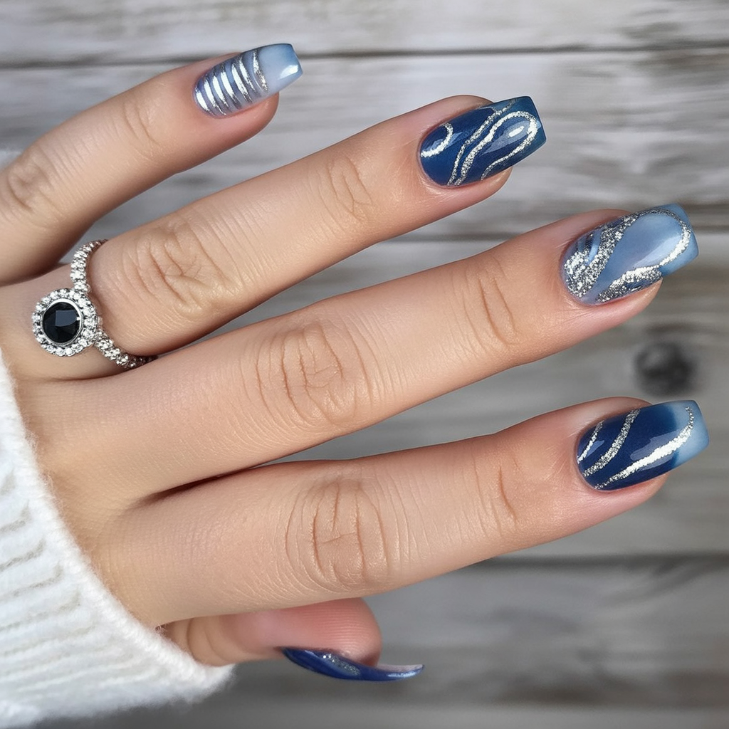 This simple art design works especially well on short nails, showing that you don’t need extra length to make a statement. The gel finish keeps it shiny and resilient through winter wear, and the mix of navy and silver makes it versatile with everything from cozy sweaters to sparkly evening dresses.