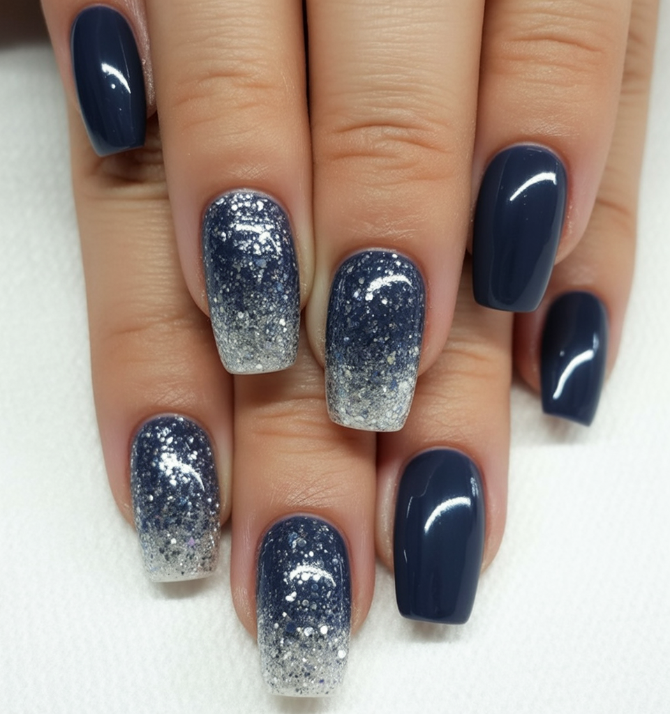 The design captures the beauty of snowsparkling under a moonlit sky. The glitter fade creates a stunning ombre effect which is both glamorous and seasonally perfect. It’s chic without being too bold, making it a great choice for women who love sparkle but still want a polished finish.