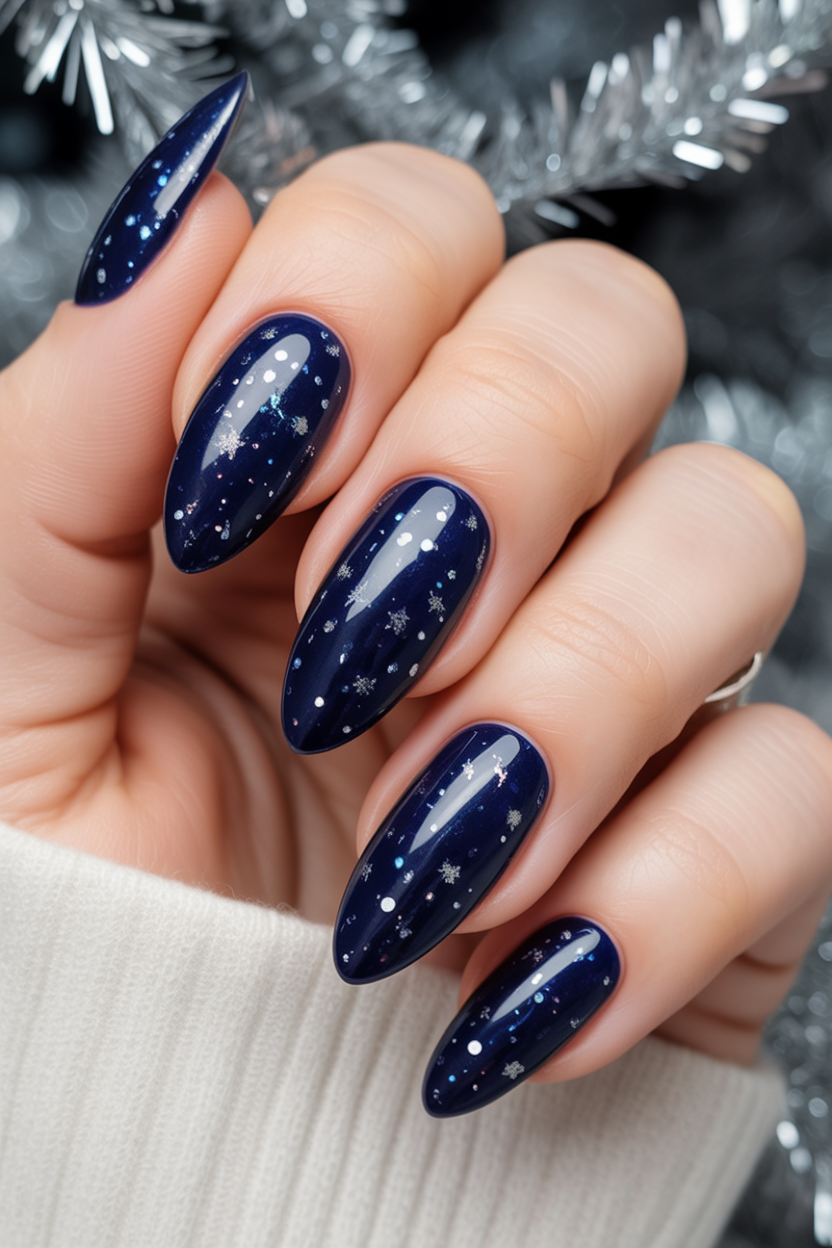 There’s something incredibly cozy about navy nails with delicate silver snowflakes. They sparkle like tiny stars, adding just enough magic to make winter days feel brighter. This design has that balance of whimsical and elegant, making it perfect for anyone who wants seasonal flair without losing sophistication.