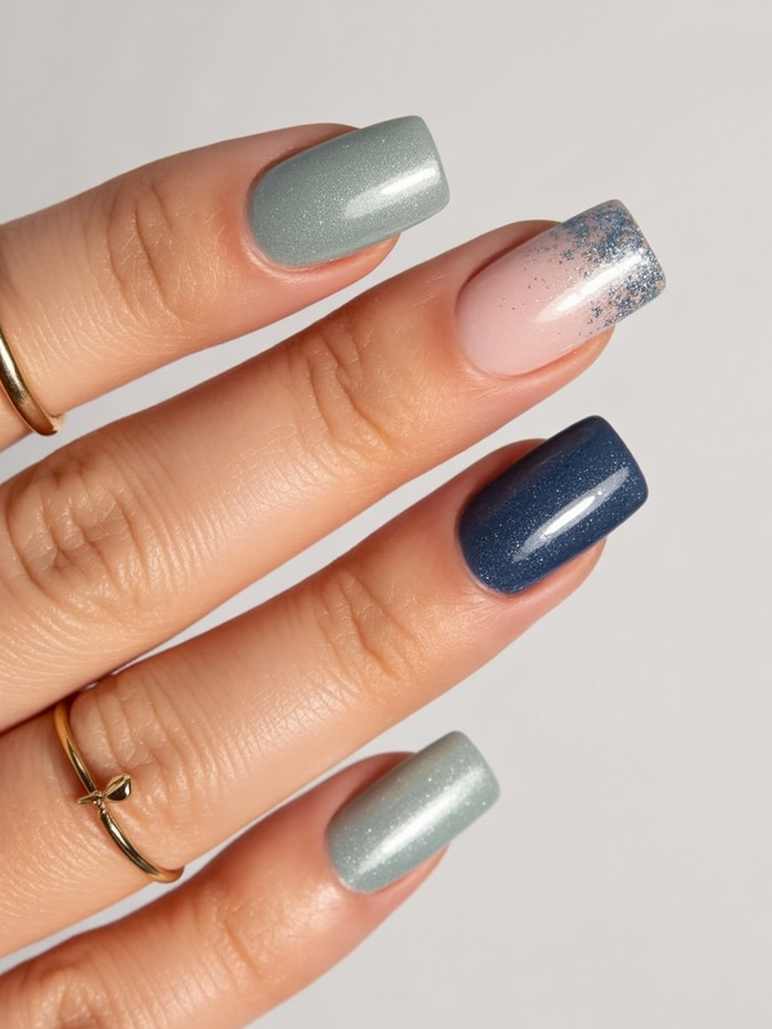 This manicure feels like a breath of crisp winter air—light sage, soft pink, and a deep blue that grounds the look. The subtle glitter detail on one nail adds just the right touch of sparkle, like sunlight catching on fresh snow. It’s gentle, fresh, and full of quiet charm.