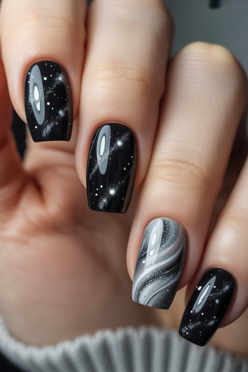 There’s no mistaking the cosmic energy in this design—it feels like looking into a faraway galaxy, full of swirling stars and shadows. The black base makes it moody and chic, while the marbled silver nail creates depth and dimension. It’s mysterious, daring, and unforgettable.