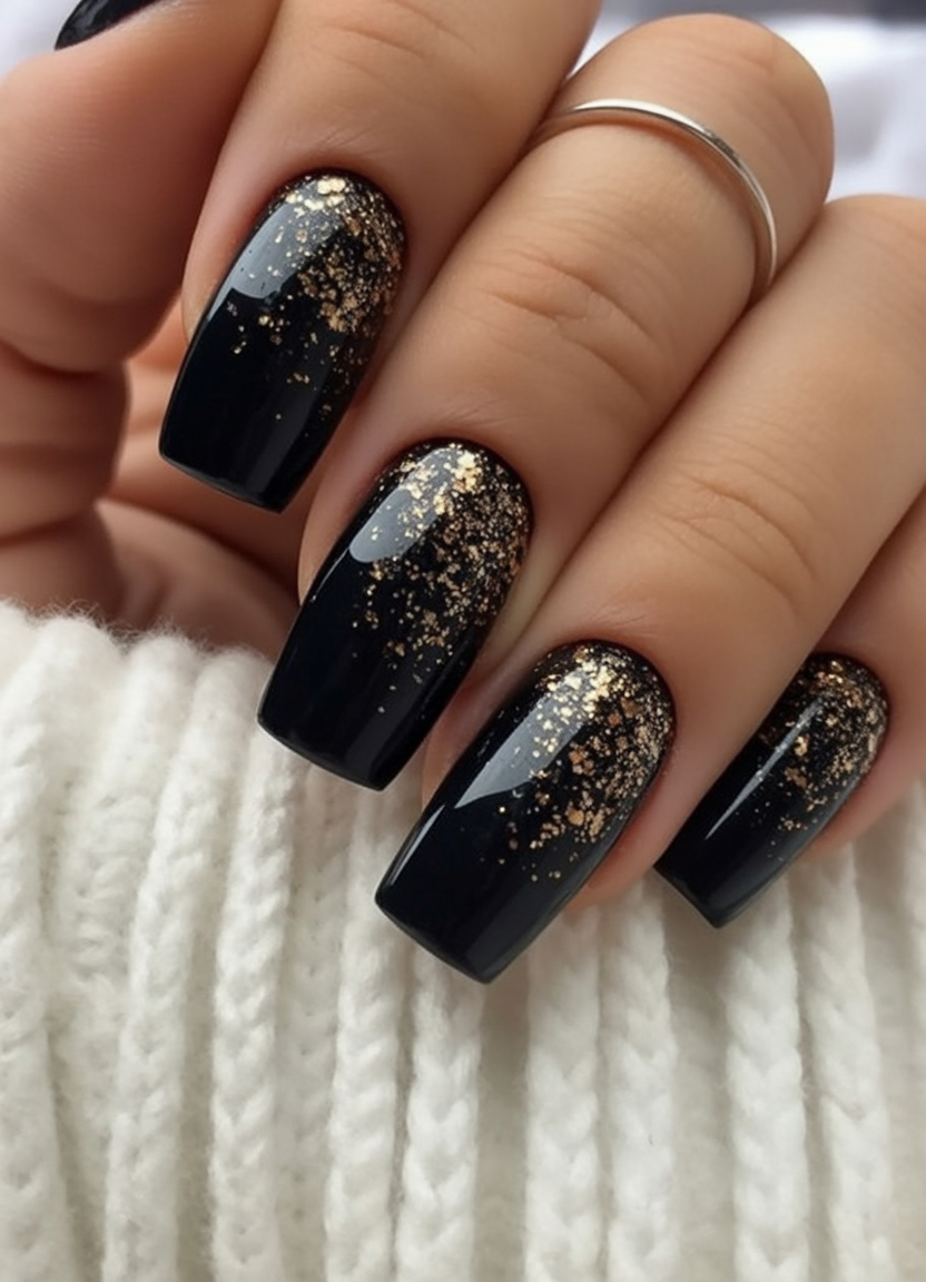 There’s something luxuriously warm about black nails topped with gold glitter—it feels like holding a glass of champagne at midnight. This look is confident, glamorous, and just the right kind of extra for January evenings. It radiates elegance while keeping a playful edge.