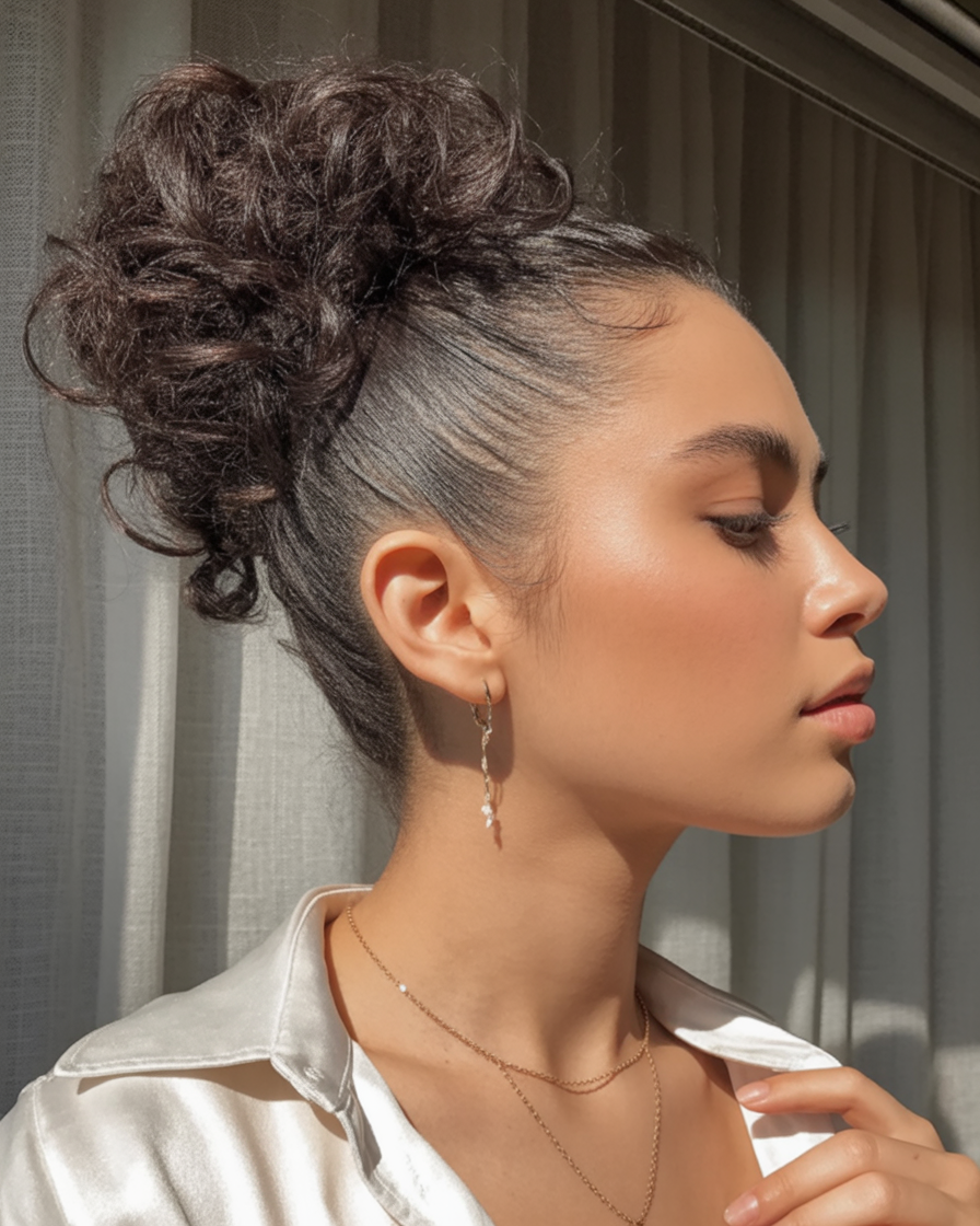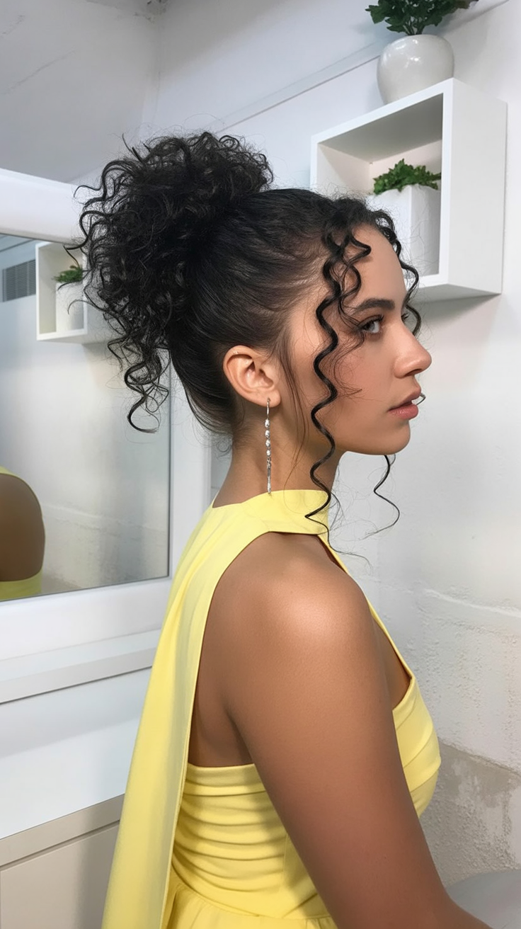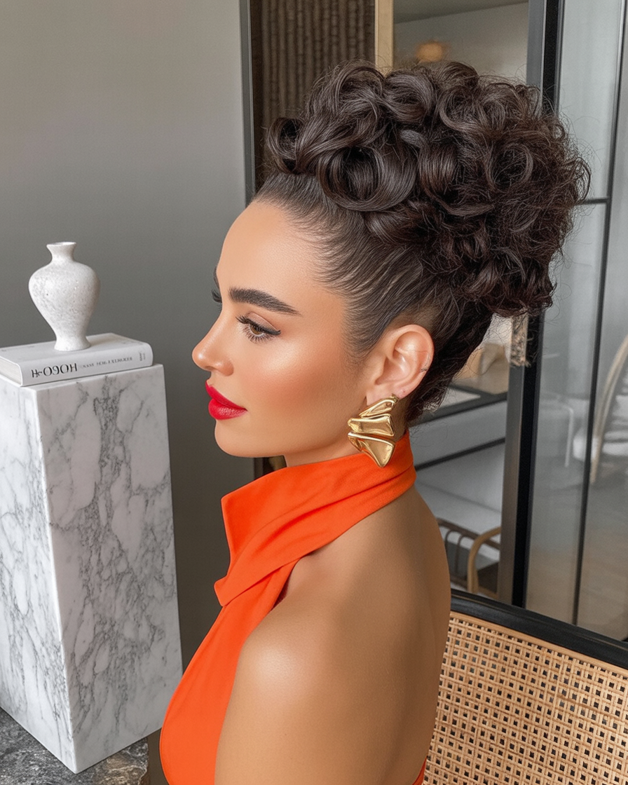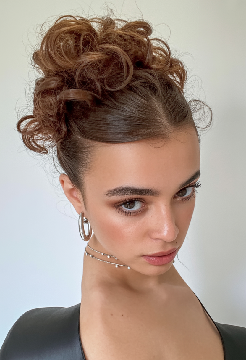This updo is ideal when you have curly hair or want a wavy texture; it is a win to have more volume without feeling excessive. Apply a curl-defining cream to set each loop and finally Use a light-hold spray to retain bounce. It is beautiful both as an addition to the party in summer, and whenever you feel like putting on as much of your creative side as possible.