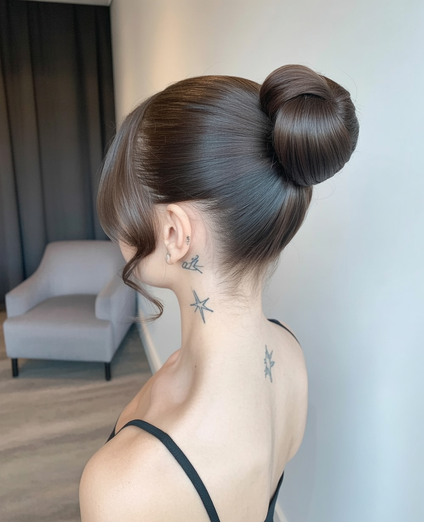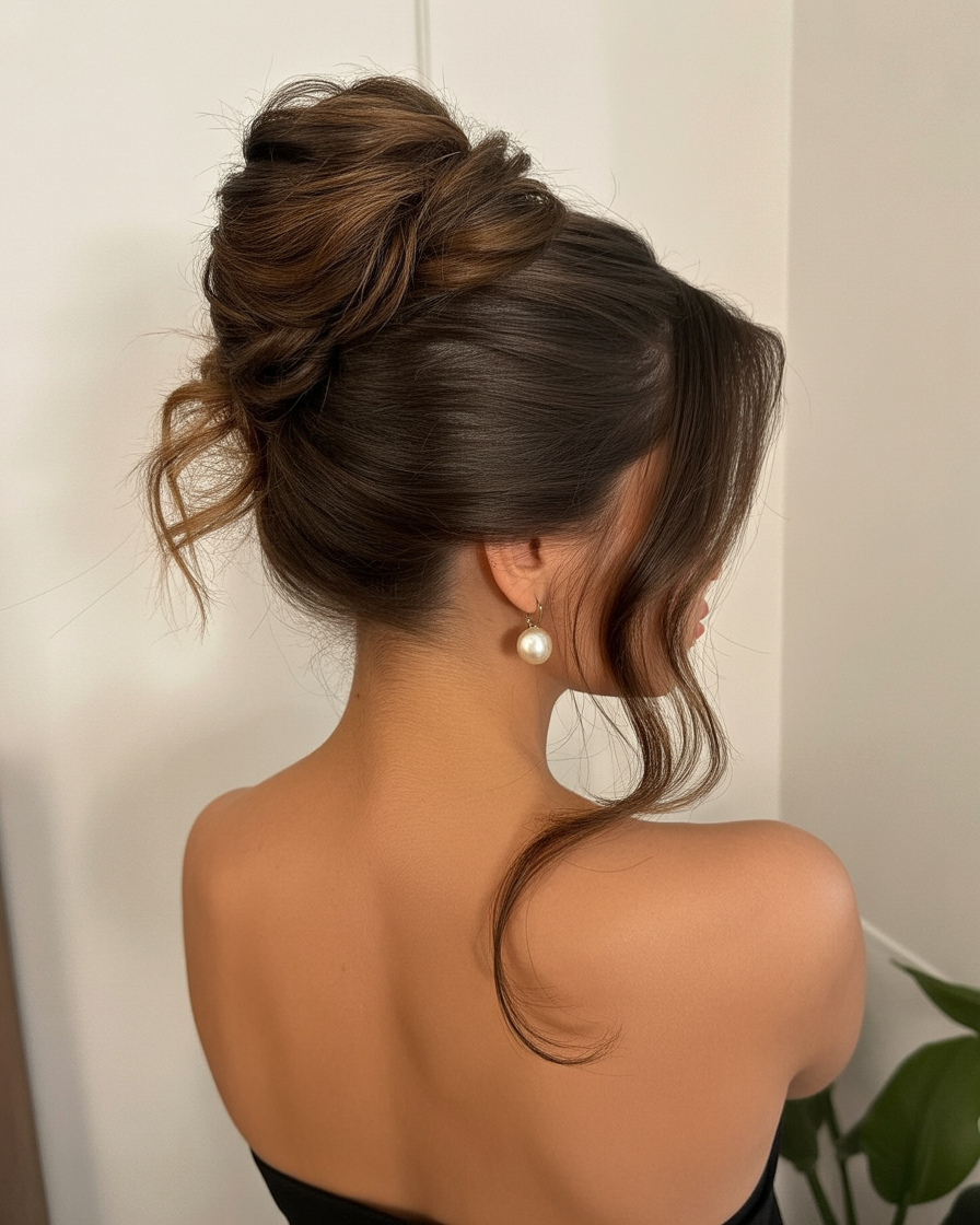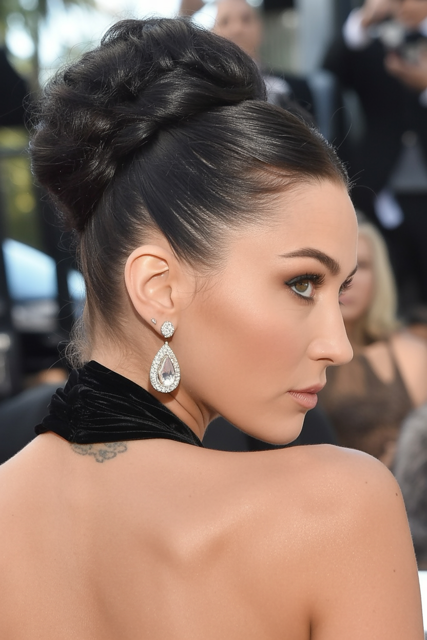 This upswept high bun is strong, and is sleek at the bottom, piled up at the top and comfortably finished by a smooth wrap. It is such a look that makes you feel tall, confident and ready to spend a night that goes well beyond midnight.