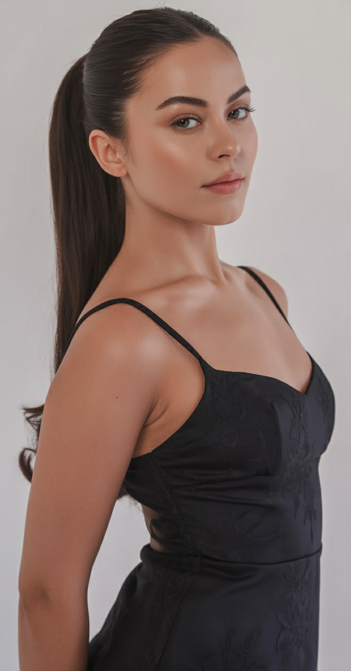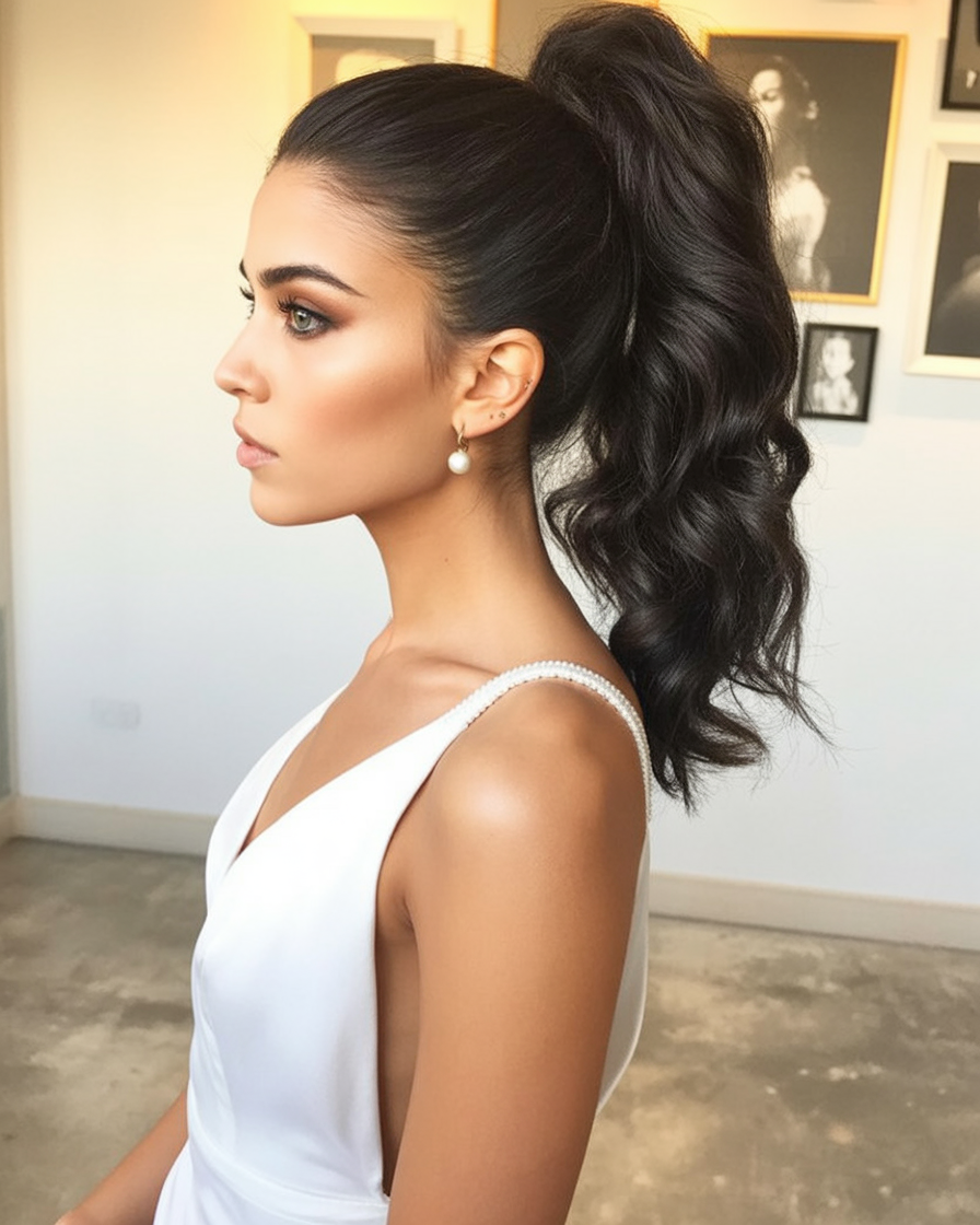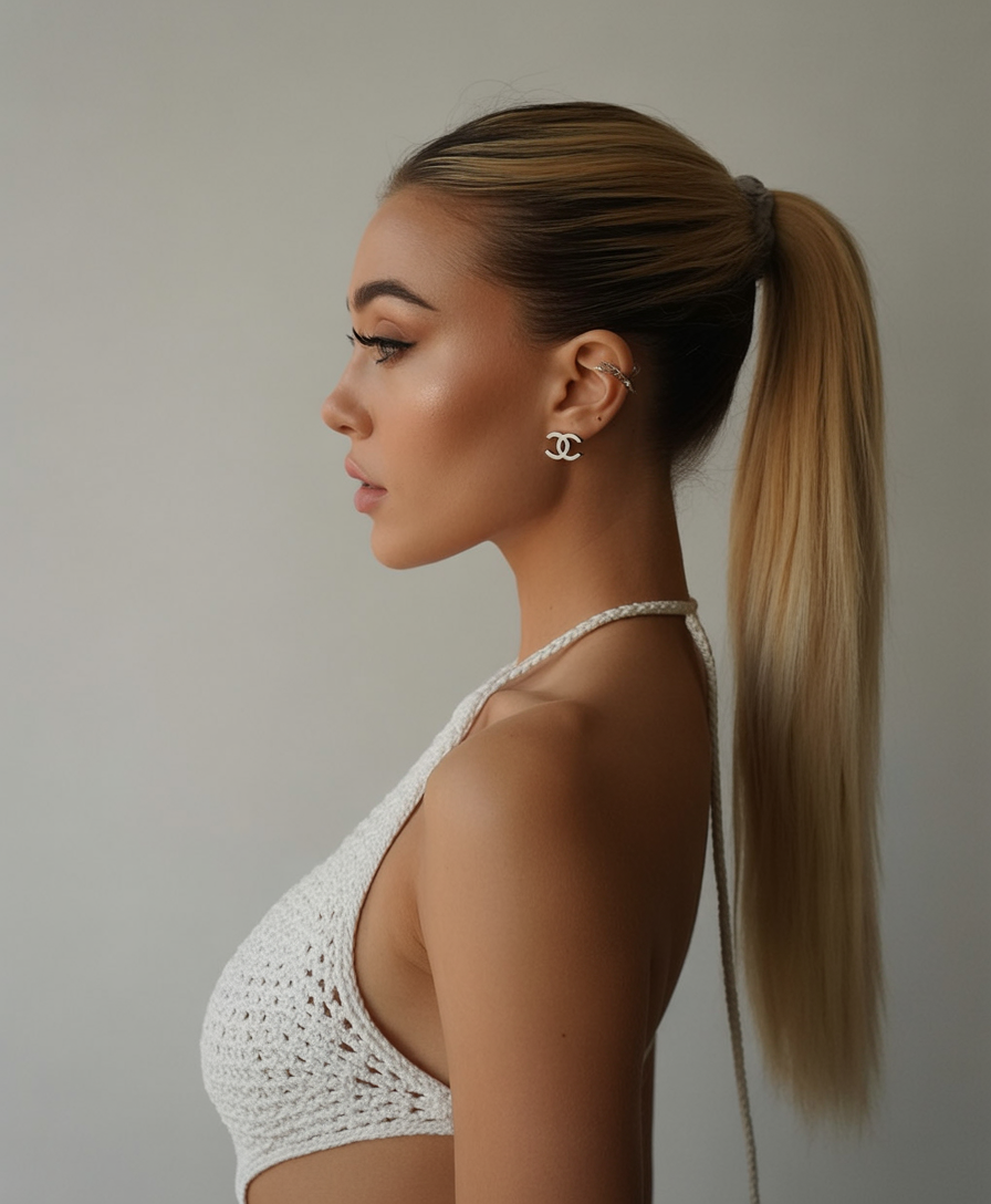 Oversized, long, and shiny-a ponytail that announces a woman has well-oiled hair with little need to work hard at trying to look good. It is sleek at the top and also flows smoothly down along the back and is sporty and chic.