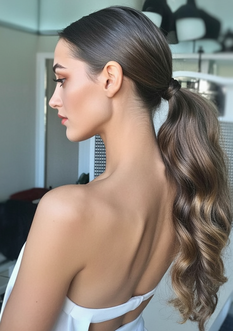 Wavy ends and sleek on the top this is a low ponytail with a twist. The minimalist aspect is given due to clean middle section and pulled back look, yet the finish is made more feminine with the waves.