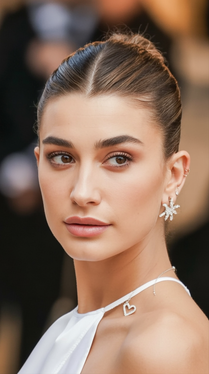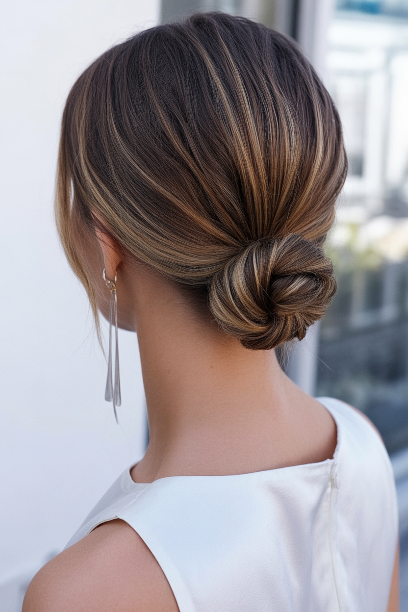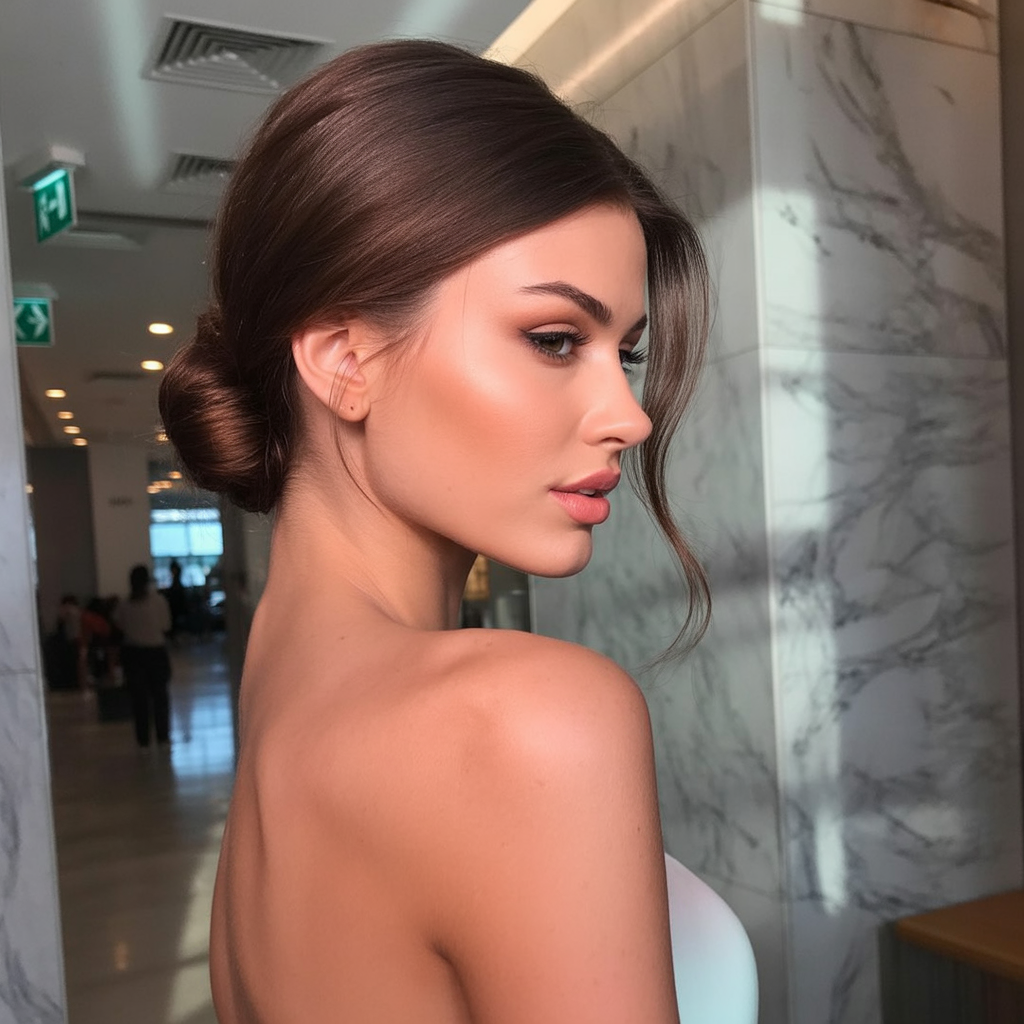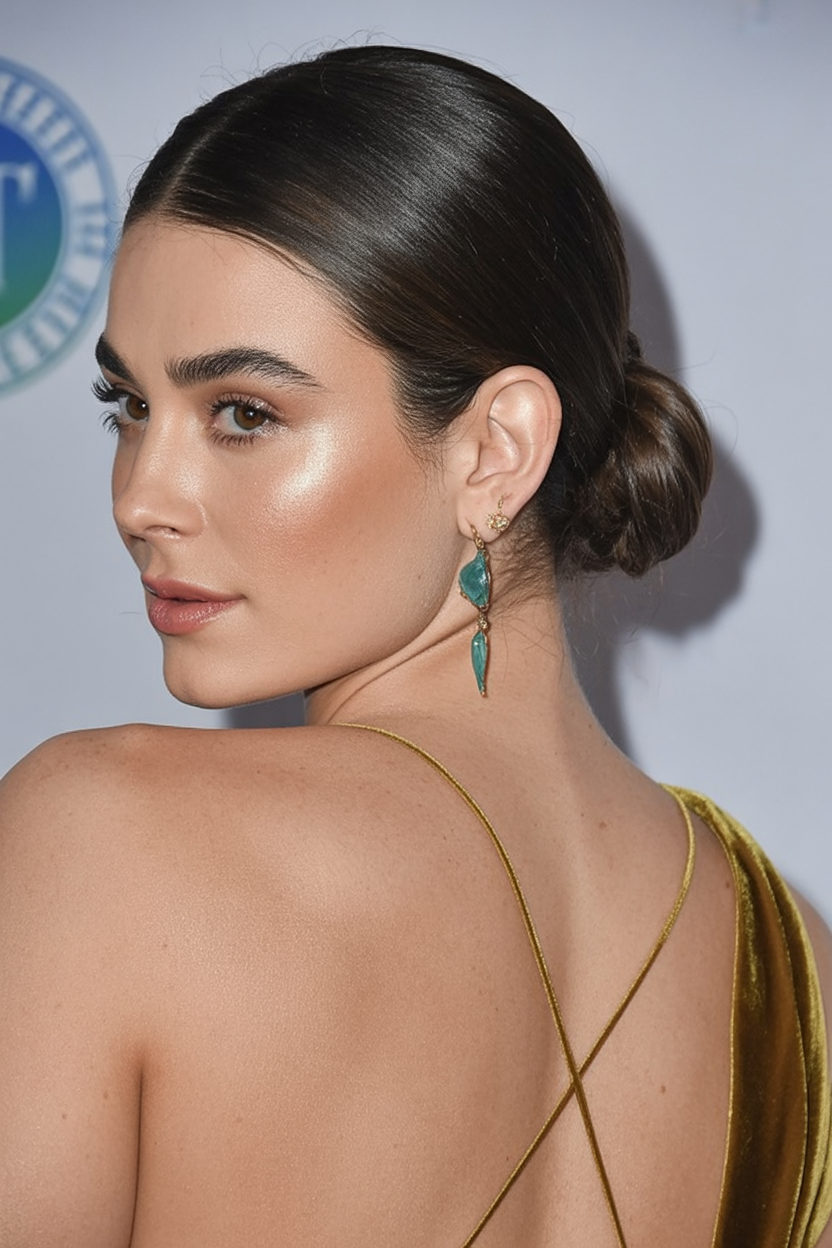 This look has a tousled twist bun that is structured and moving at the same time but still appears chic and accessible. The light strands that are drifting around the face provide the suitable amount of softness.