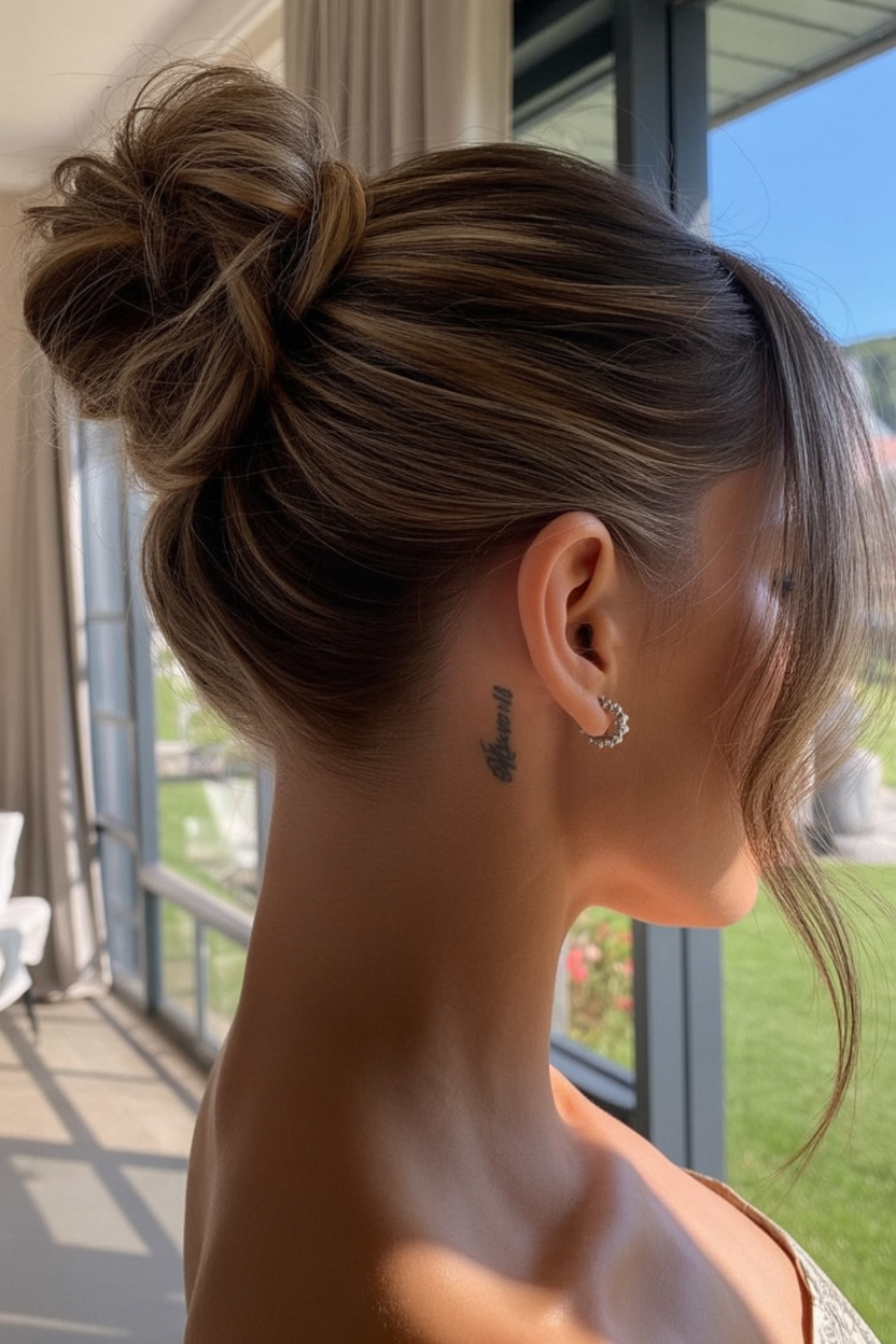A wavy high bun, almost glowing in the sunshine this look has that effortlessness of I looked in a mirror and this is what I thought of I don t know but it still looks beautiful. The combination of structured curls, as well as airiness, is a picture that idealizes that halo effect of romance, exactly the kind that will strike during golden hour.