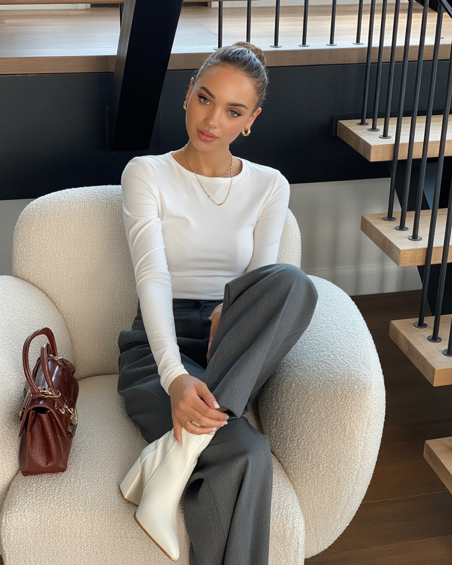 There’s something very calm and quietly powerful about this look. The fitted long-sleeve top paired with tailored trousers feels minimal but intentional, giving off a slightly preppy mood without being stiff. It’s the kind of outfit that feels grown, focused, and ready for a productive Monday—polished but still relaxed.