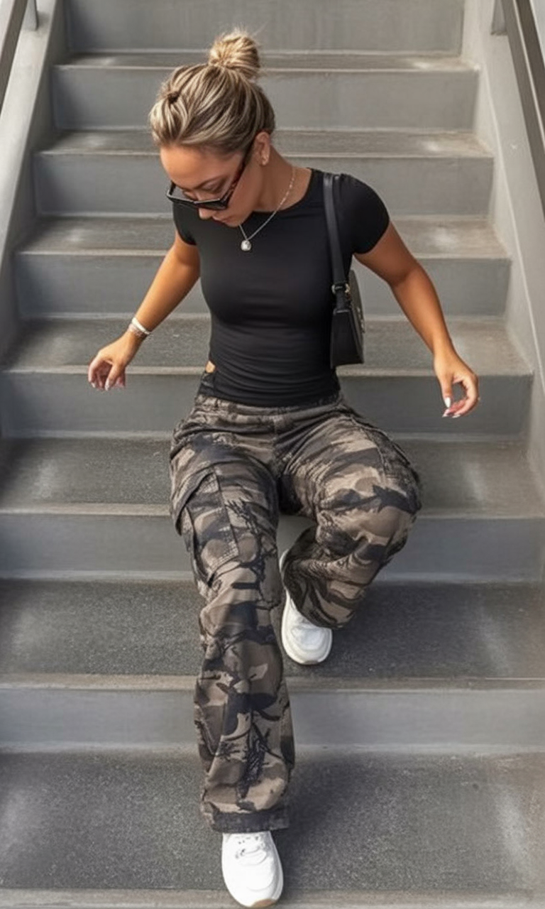 This look has that confident, no-nonsense attitude that feels effortlessly cool. A fitted black tee with cargo-style pants leans into an athletic, slightly baddie mood without feeling over the top. It’s strong, practical, and gives off serious “I know where I’m going” energy—perfect for busy school days.