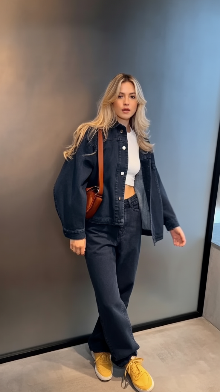 What makes this look special is how easy it is to wear. The loose denim keeps it comfy, while the cropped top adds a sporty twist that works great in summer or on warm spring days. Sneakers make it quick and practical, making this one of those go-to ideas when you want style without effort.