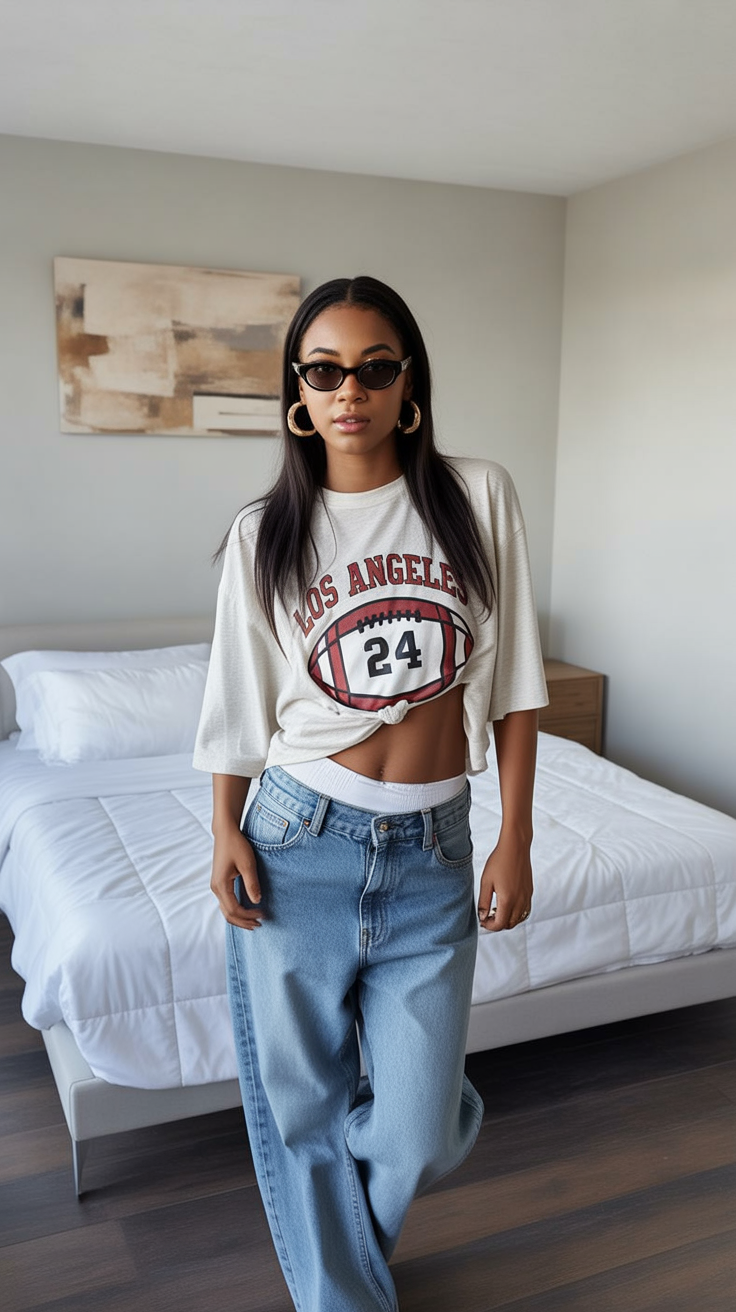 This outfit has that relaxed, slightly athletic energy that feels very now. The cropped sports tee paired with loose jeans gives off a chill, confident mood—like you’re ready for class, errands, and whatever comes next. It’s casual, cute, and feels very natural for a Friday vibe.