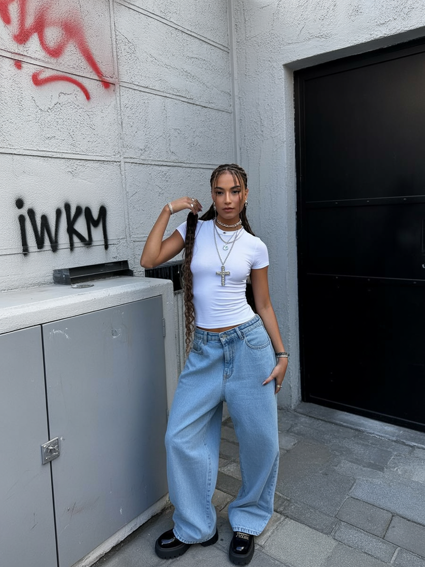 This outfit blends casual street style with a confident edge. A fitted white tee and wide-leg jeans feel timeless, but the overall vibe leans slightly baddie thanks to the attitude it gives off. It’s relaxed, cool, and feels very current without chasing trends.