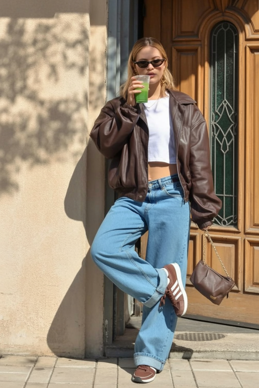 There’s something timeless and effortlessly cool about a leather jacket layered over denim. This look feels urban, confident, and perfectly casual—like a quick coffee run between classes that somehow turns into a full street-style moment. It’s relaxed but polished, with just enough edge.