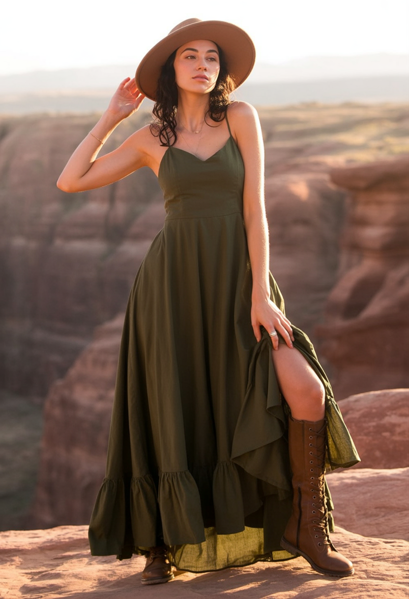 This style appears to be right out of a canyon photo shoot and into your closet. The lush olive maxi with its dramatic hem and desert hat brings all things adventure, and finishing it all out with lace-up boots balances it all out.
