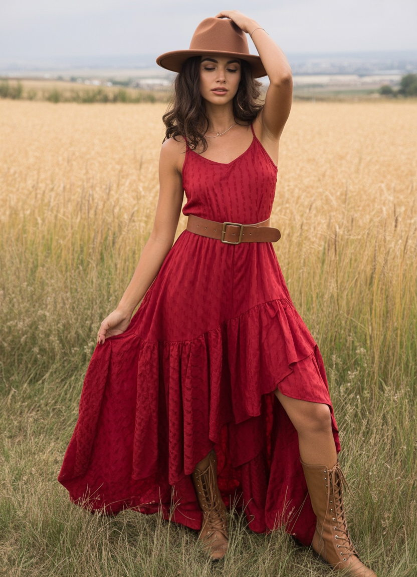 This is indeed one of those dresses that exudes confident, romantic, and, above all, daring fashion. Hot red with its matching belt and paired with tan lace-up cowboy boots, one can’t possibly think of anything better—if you ask me, at least—than this beautiful boho dress with its belt and boots. The long hem and earthy tones make one think of Mother Nature, and then, of course, there’s red, and it’s perfect any time of the year.