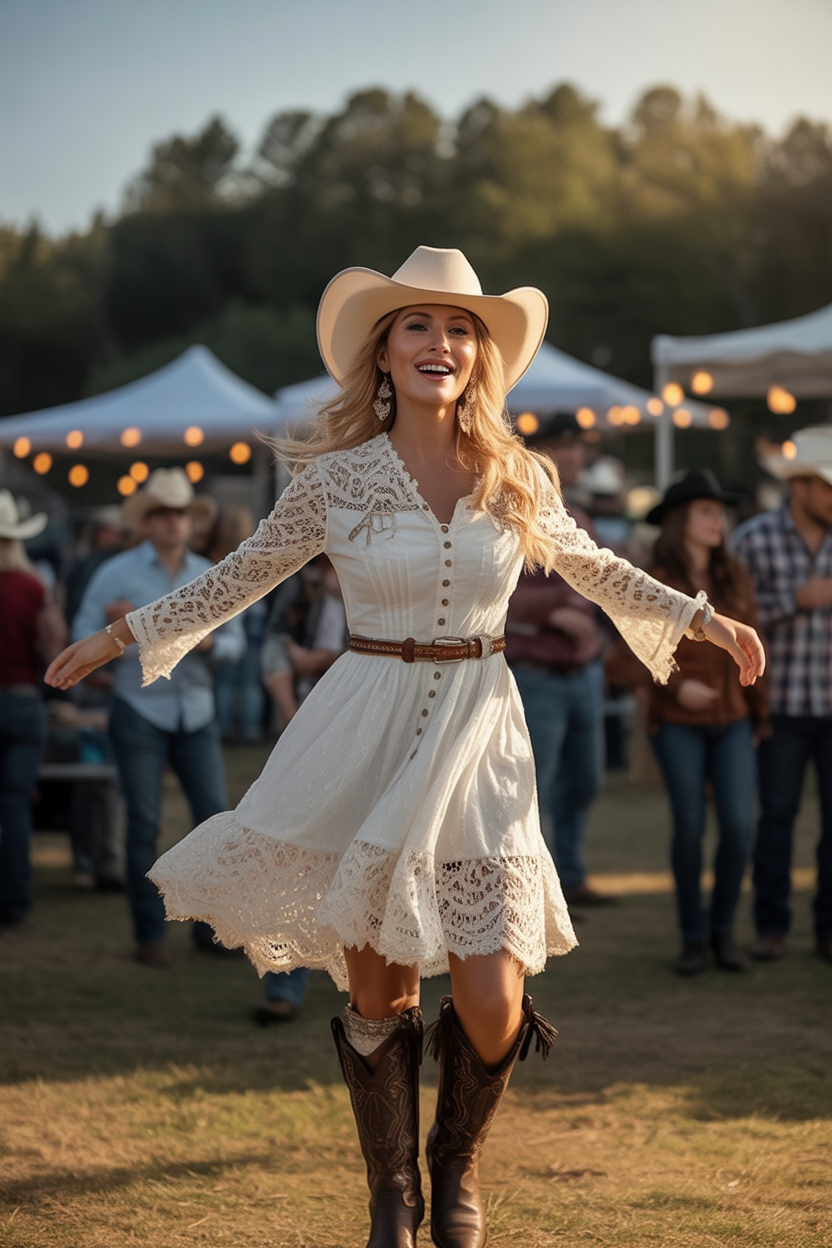 There is something downright delightful about mixing and matching white sundress fashion with traditional cowboy boots. This one is fun without ever really having to make an effort, so it’s positively radiant and fun, kind of like spring and Southern sweetness all mixed into one package.
