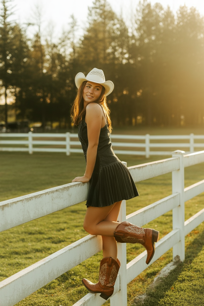 Flirty and fierce come together with this black denim mini dress featuring a pleated hem, which kicks up high and nicely under golden lighting. Add this white cowboy hat and those luxurious boots, and you’ve got yourself some serious edgy and sweet combined—this is a modern cowgirl with a side of ROCK AND ROLL!
