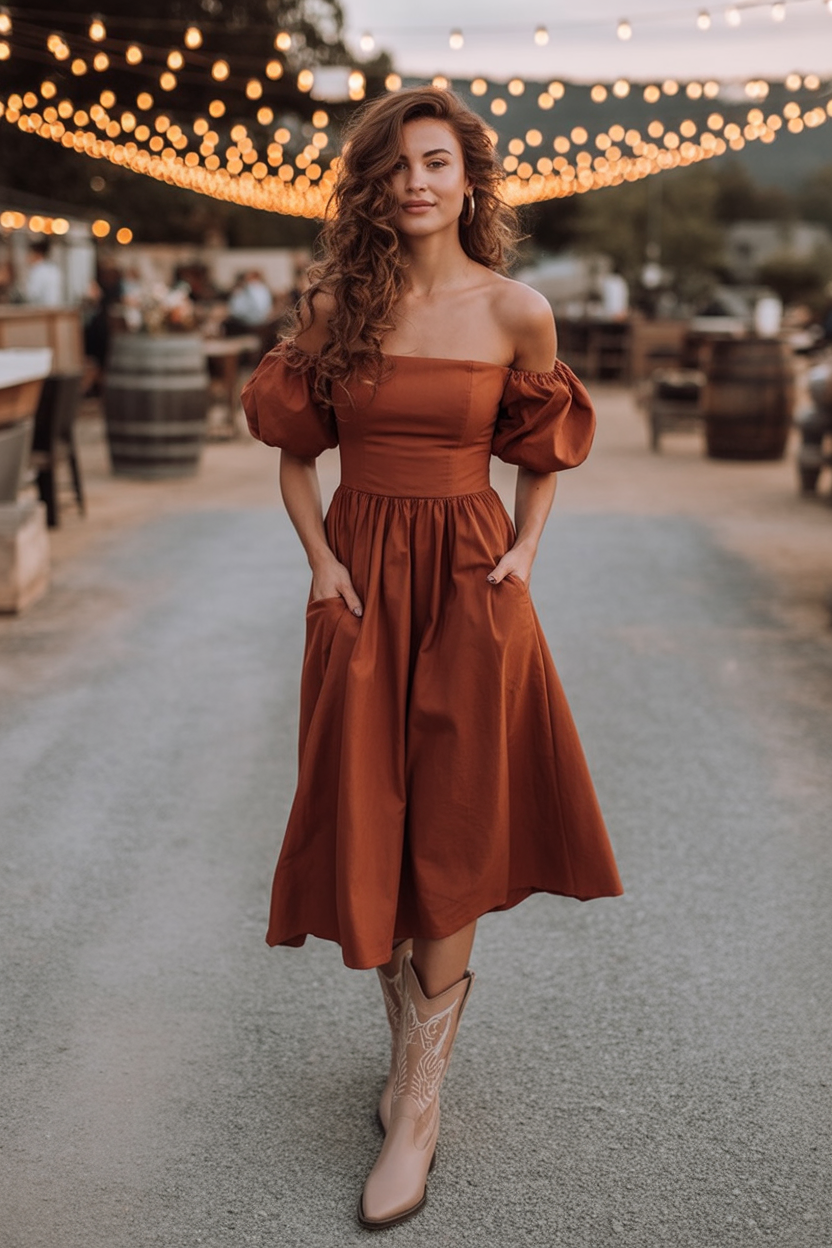 This rich rust-orange dress is everything we love about fall fashion—cozy, festive, and oh-so-flattering. The puff sleeves and off-shoulder neckline make it feel flirty and feminine, while the cowboy boots add just enough edge to keep it grounded. Think hayrides, cider, and slow dancing under fairy lights.