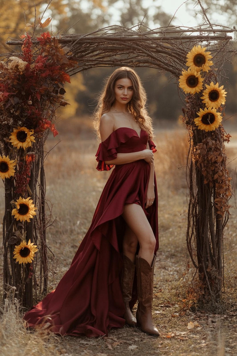 Romantic, dramatic, and slightly wild, this opulent wine-colored floor-length gown with off-shoulder sleeves and trailing train makes you feel like you’re living in your own dream world, with cowboy boots peeking out from under it, no less. This knockout outfit is perfect for those with an hourglass and curvy figure, with its structured top and fuller bottom. It’s perfect for an outdoorsy, high-fashion wedding or photo shoot. Pair with romantic waves and expose your shoulder—you will be unforgettable.