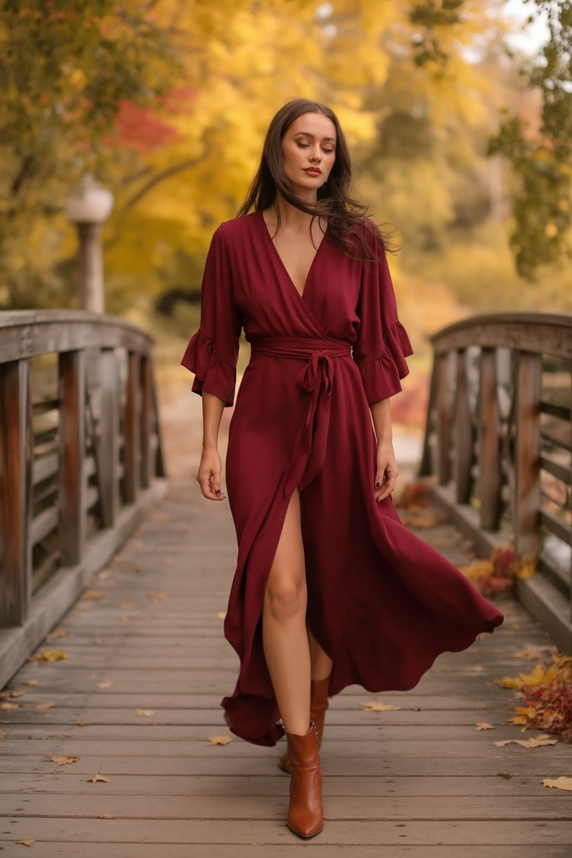 This burgundy wrap-around dress with cowboy boots is perfect for when you want to be equal parts cozy and authoritative. The color may be dramatic, but its eased lines and your fluid movement will make you come alive, speaking directly to your poet’s soul. So if you are attending an autumn evening reception or a mother of the bride brunch, this one is perfect. The fabric is ventilated and luxurious, and its wrap design is incredibly flattering, regardless of your shape. Simply add a berry-colored lip gloss, and you are good to go!