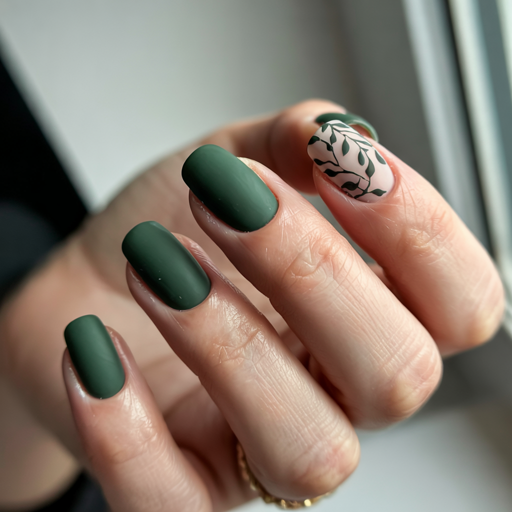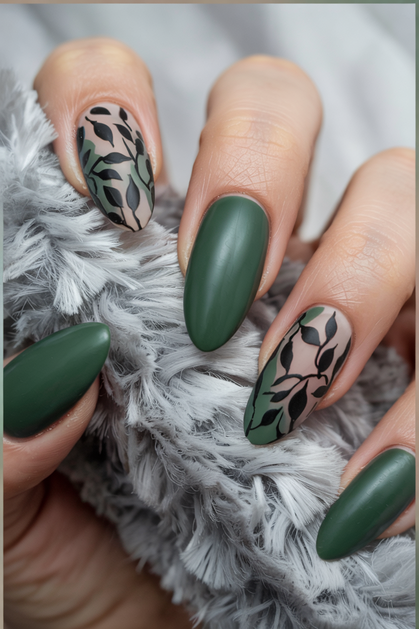 These nails would be the invitation to a secret garden should fall have one. A combination of soft matte green and translucent manicures with deep black and sage leafy patterns on the accent nails build a mystery, some kind of a fairy-tale atmosphere. These read like a silent journey through a forest in the rain and each step hurts as it crunches golden leaves.