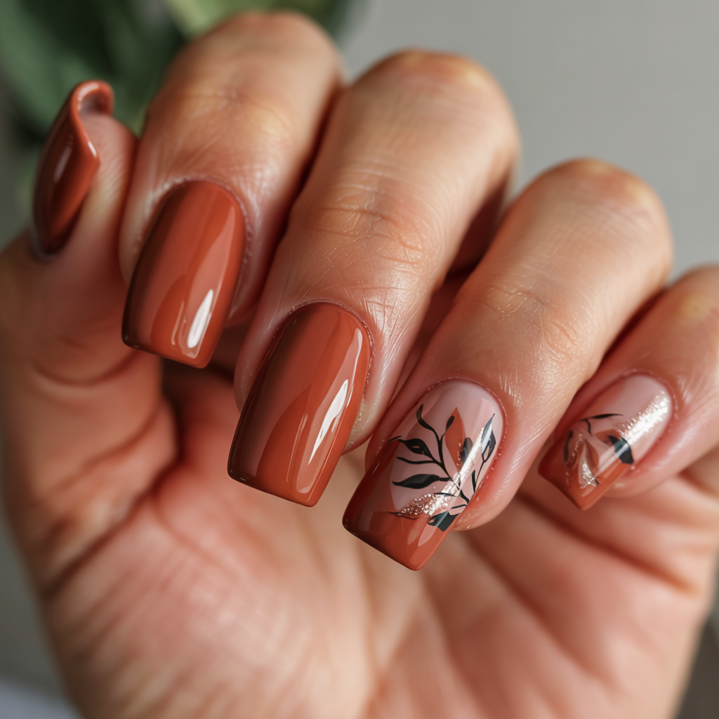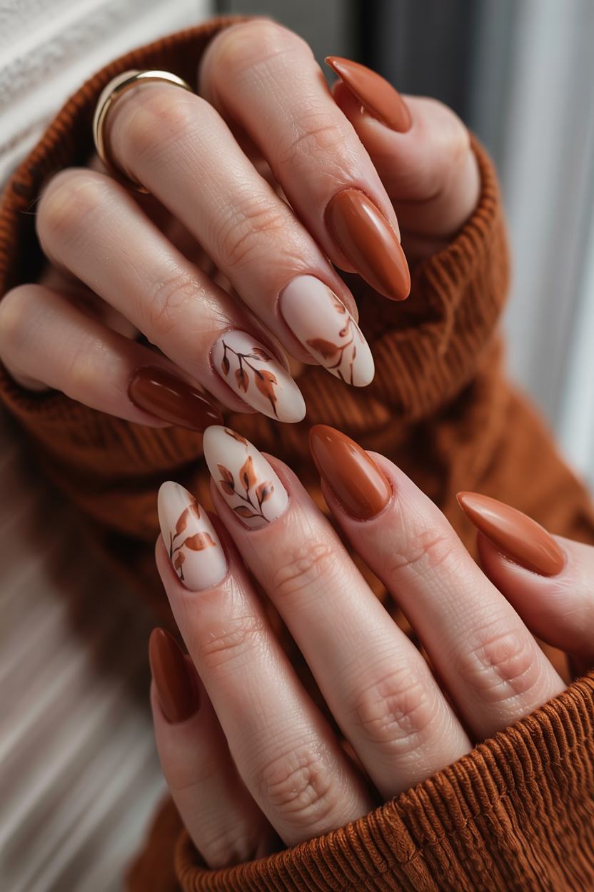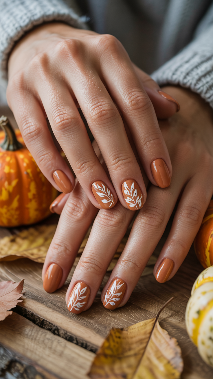 There is a certain element of the grounding energy of warm and earthy tones when the leaves in their turn start changing. These terracotta nails will make you feel like you are in a pumpkin spice latte on your finger tips–they are so lovely and homey, and great put-on-her-fingers magic. The subtle designs of the white branches give it an elegant, artsy detail that communicates love of autumn, without screaming about it. Ideal to huddle up in in thick jumpers and gaze a mug of cider.