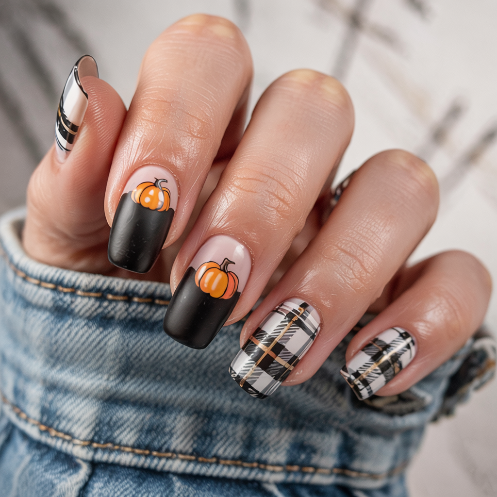 Is it even fall without plaid and pumpkins? This combo is adorable, the orange pumpkins are playful and contrast enough with black tips and a couple of well-executed plaid designs. It is a bit cheeky, a bit classic and a lot of fun. These nails are reminiscent of your favorite flannel shirt and scarf all in one festive mani.