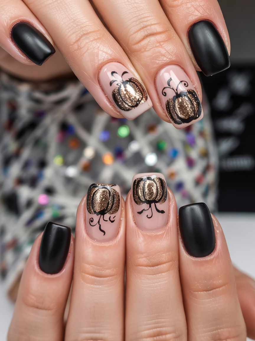 These nails bring major personality to the party. The contrast of matte black and nude makes a strong statement, but nothing can match the gold pumpkins mania- almost all of them were adorned with a print of a pumpkin. It is a fun, fall reference with a twist of eye-catching glam. These can be thought of as your nail polish equivalent of a sequined Christmas dress.