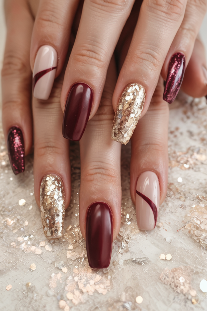 The nail set is bold, decadent, and a bit dramatic, but it will be the show-stopper of this Thanksgiving. Dark burgundy looks spectacular with nude pinks and shimmering gold in an outfit that is at once comfy and luxe. It feels like velvet on your fingertips, and it looks great when it is coupled with chunky knitwear or a little holiday bling.
