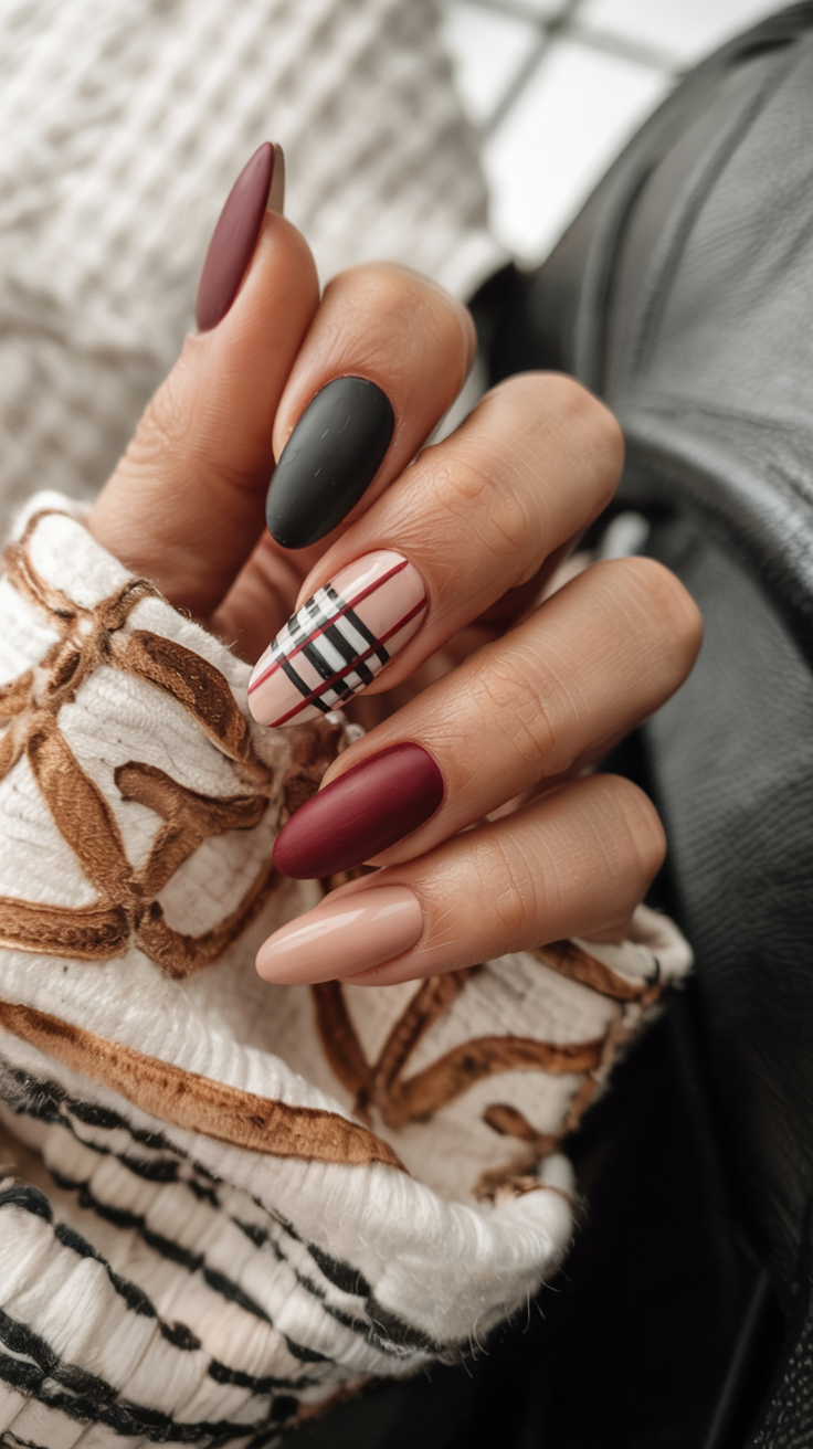 This plaid nail art is the most welcoming and stylish mani eaten with warm fuzzy coats and chic vibes. The black and burgundy colors on the one hand and the nude and classic plaid on the other create a stylishly cosy effect and they are perfectly wearable at present. It is the look that can make people come and see what you are up to in the coffee line.