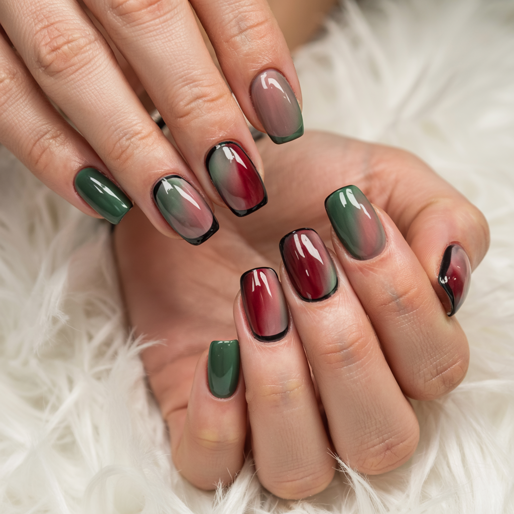 This combination of green and burgundy with gloss level is like autumn sunsets and evergreen forests. All this is underscored by the sleek black outline that gives the whole image a tangible graphical frame. It’s artsy without being over-the-top—a perfect mix of natural tones and creative art.