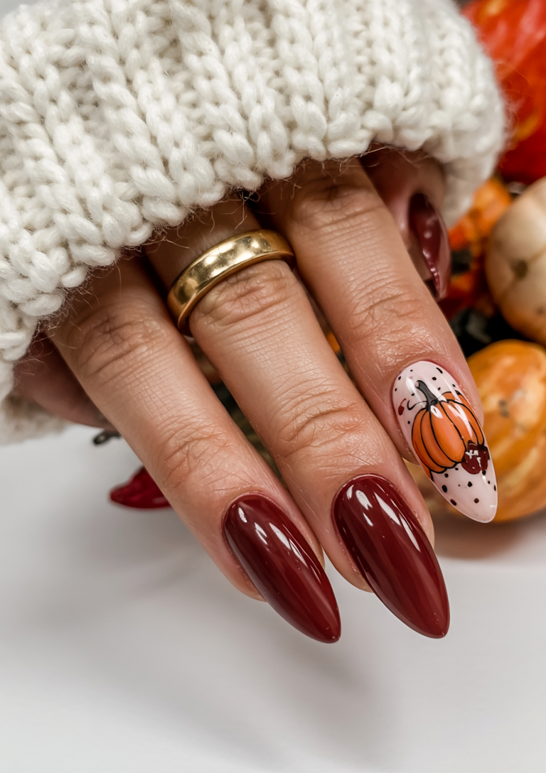 These fall almond nails suit the ladies who wish to have a fall-looking mani that is stylish yet subtle. The matte texture gives it a modern flair and it elongates fingers to absolute perfection because of the almond shape. It’s low-key art that still feels festive.