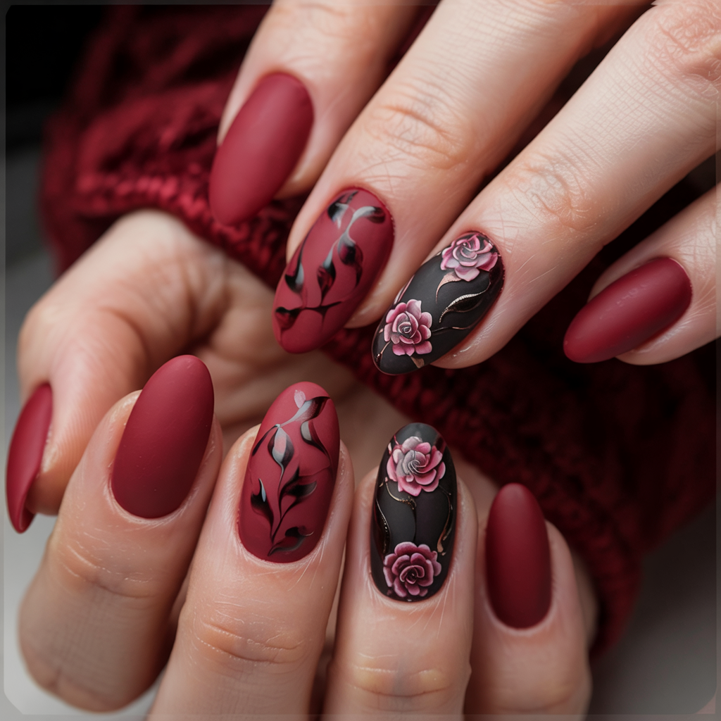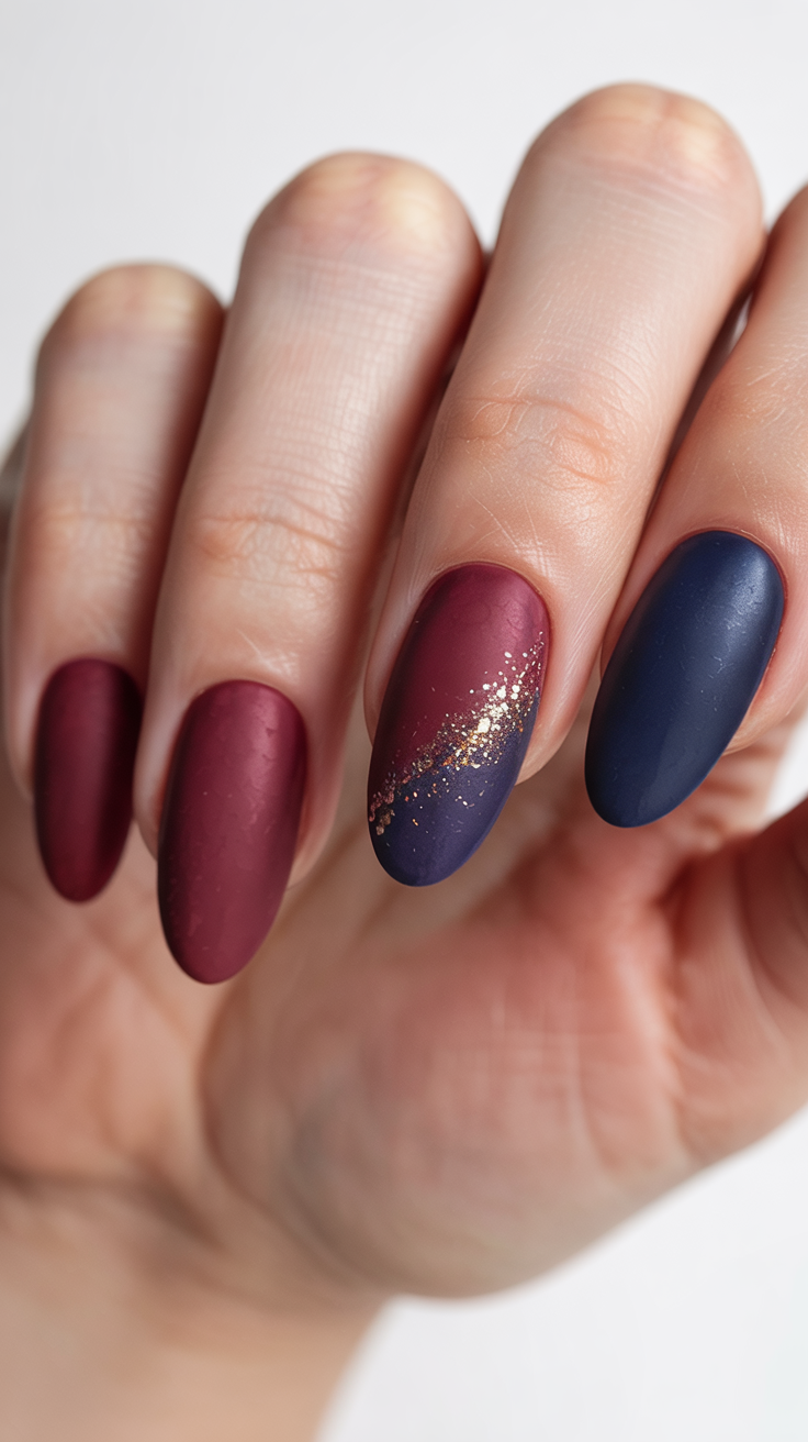 Dark, gloomy shades can be bright yet moody, just like in the case of this striking matte combination. The navy and the wine combination is classy and surprising with just a little dose of gold sparkles to complete the look. It is cozy like a candlelit dinner with the people you love the most, romantic, audacious, and a bit mysterious.