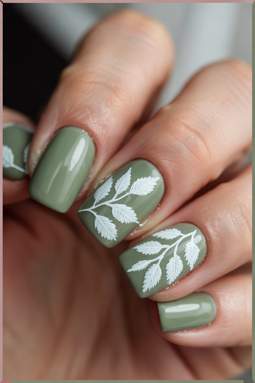 This new sage green nail polish is cool enough to be a hit of fresh November. Nature is introduced into the design with the aid of the white leafy designs that are refined enough not to dominate the light shade. It is calm, sophisticated, and will be ideal to have a more polished Thanksgiving party.