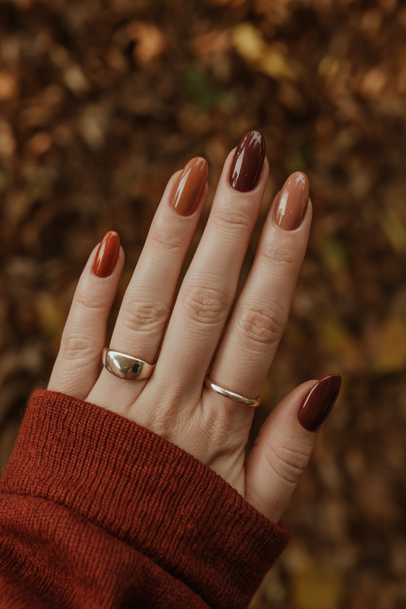 When in doubt, go classic. The daintily glossy nails alternate all the autumn flavours delights caramel, cocoa, cinnamon, and wine into a wholly uncoordinated set of colours that combines to appear still absolutely fabulous.