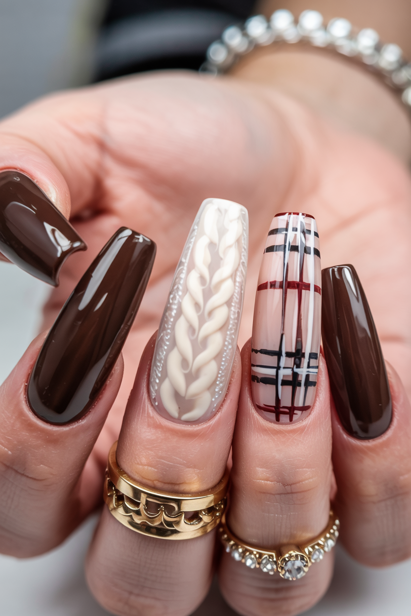 Similar to a favorite fall sweater but in the form of a nail set, this set is all about texture and richness. Intense chocolate is contrasted by a creamy cable-knit topped with a plaid pattern to create the supreme cozy-girl vibe. It is like the manicure version of sitting by the fire reading a good book.