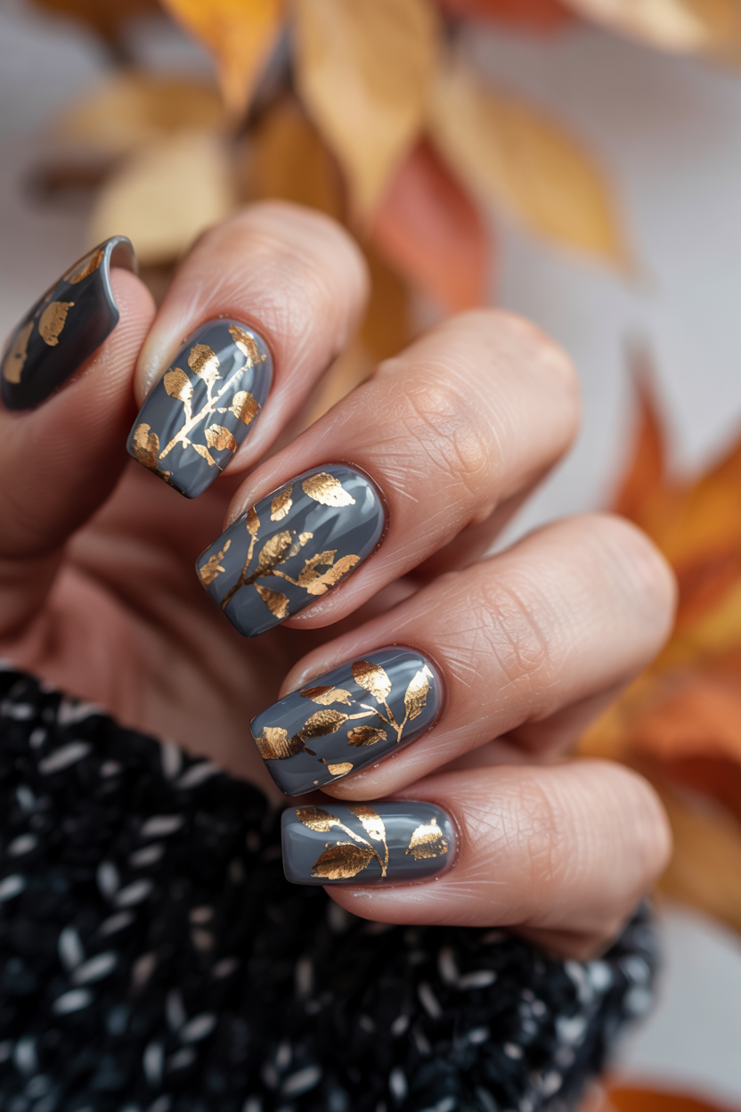 S. Gray nails may not scream fall, at least, until you add little gold foil fall demure. With its clean smokiness and fine botanical patterns, this set has the calm, minimalist appeal that makes it feel elegant and on-trend at the same time.