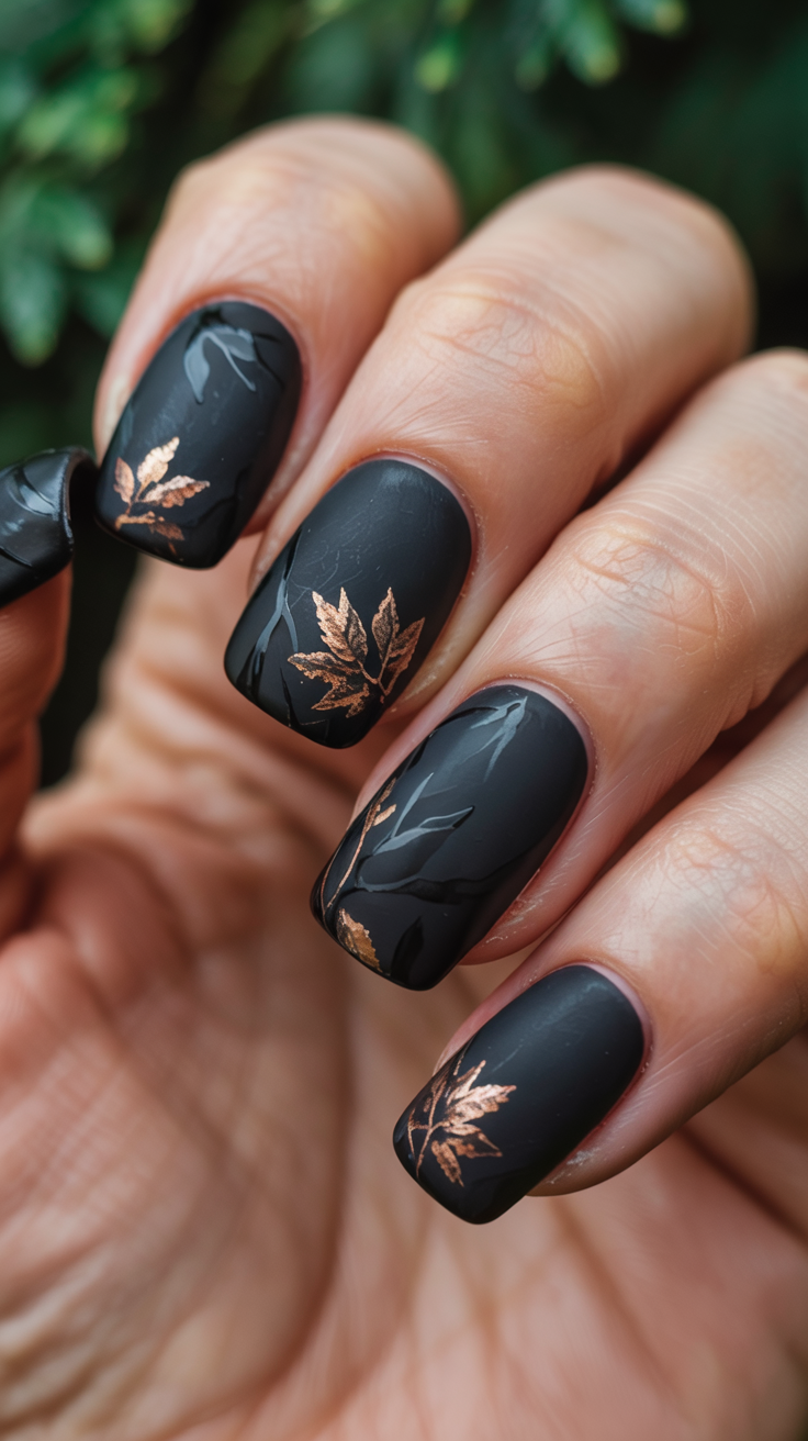 This would be the go-to manicure of fall had a cousin gothic. Shimmering designs of copper leaf on matte black nails form an extreme contrast, which is both edgy and sophisticated. It’s moody in the best way possible.