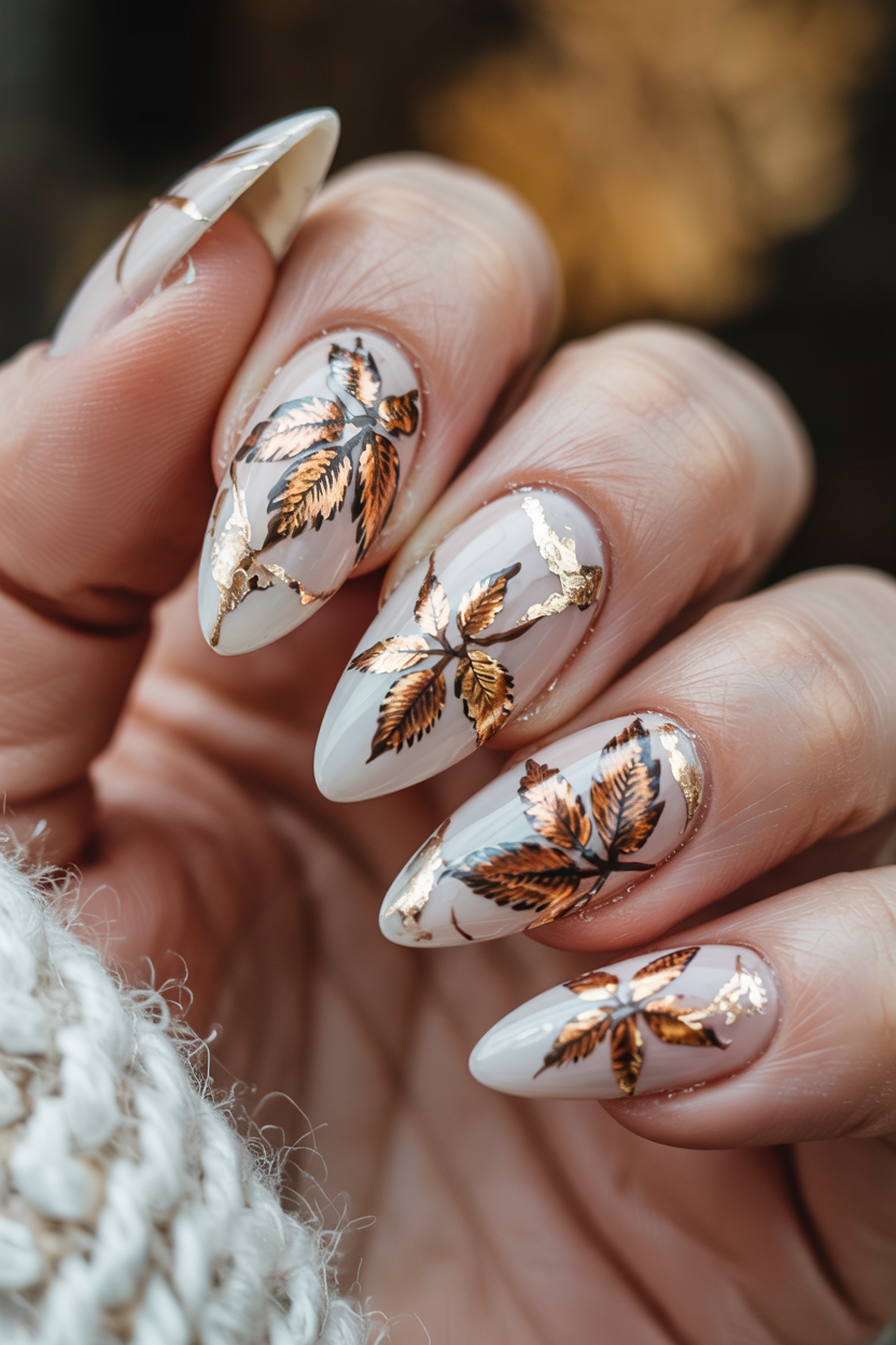 These creamy white almond-looking nails might make you feel autumn is a elegance. It has hand-painted bronze-gold leaves cascading over every nail, which looks a bit nature-inspired, yet totally extravagant, like strolling inside a gilded forest in your favorite fall coat.