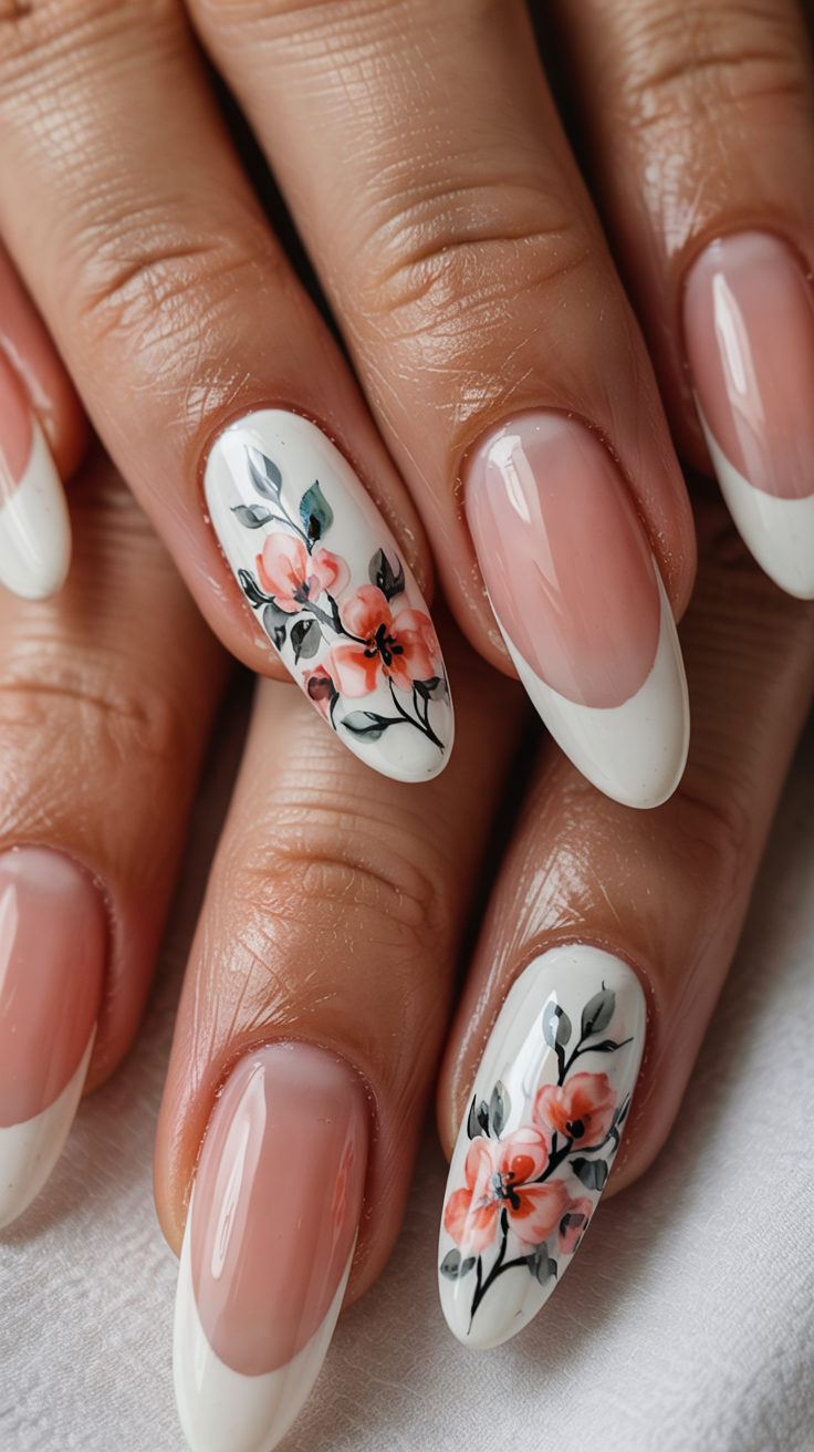 There’s something undeniably elegant about a soft French manicure—especially when it’s paired with delicate floral art in warm coral and deep green. The design gives a new and fresh feminine touch to the fall season but still keeping the same thing in time.