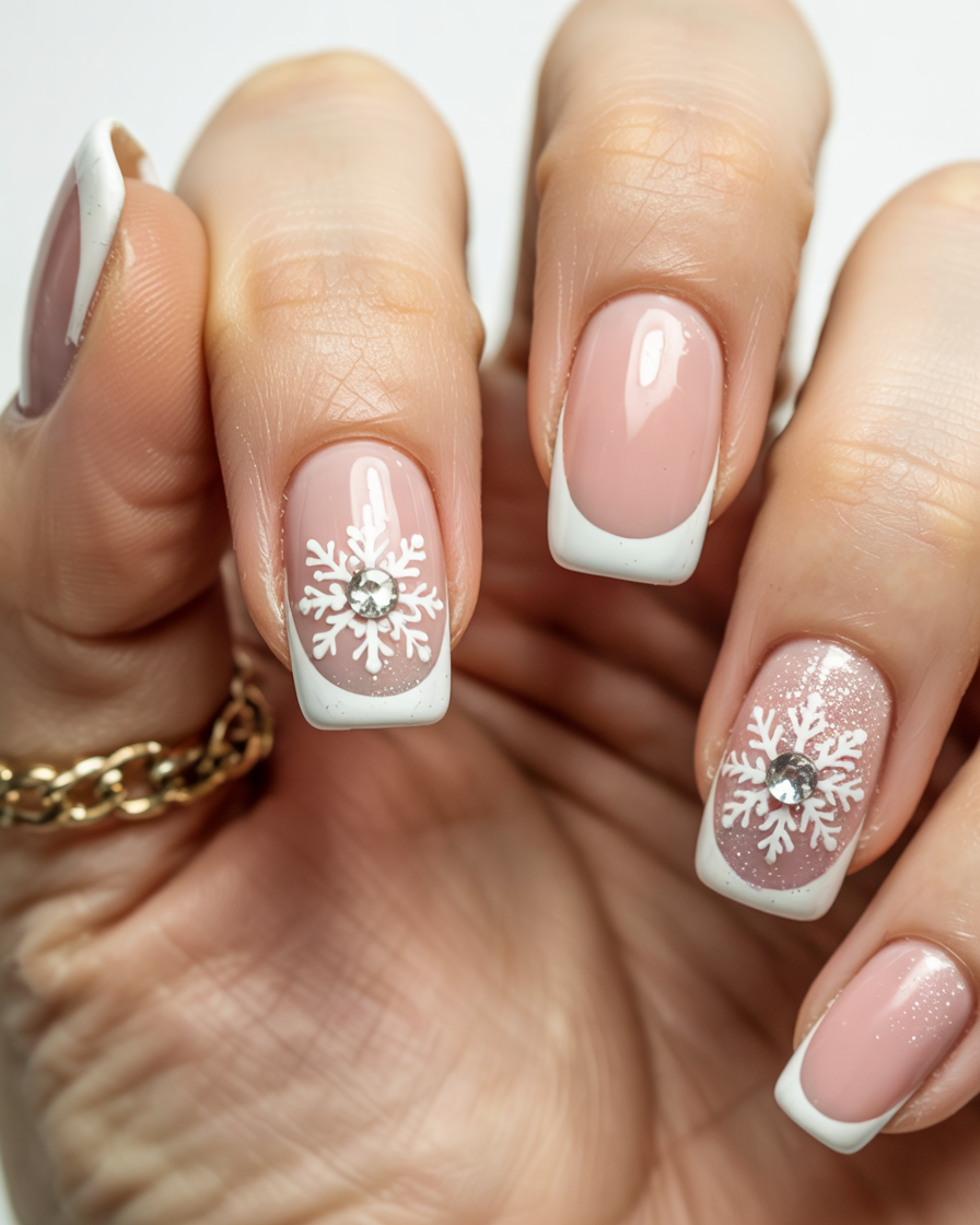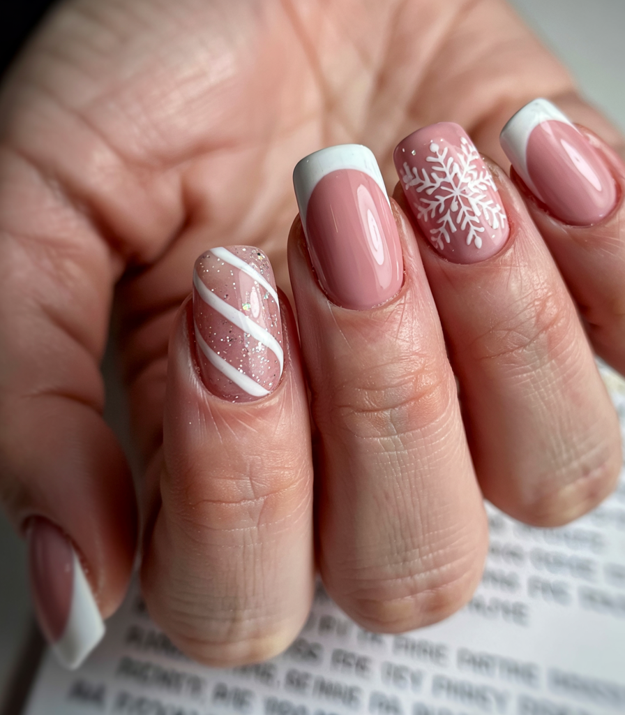 Here is a new type of French manicure that manages to feel quite modern and wintry. Soft pink nails with white tips get a playful variation in the form of candy cane stripes and a delicate snowflake. It’s like honoring the classics but with more personality.