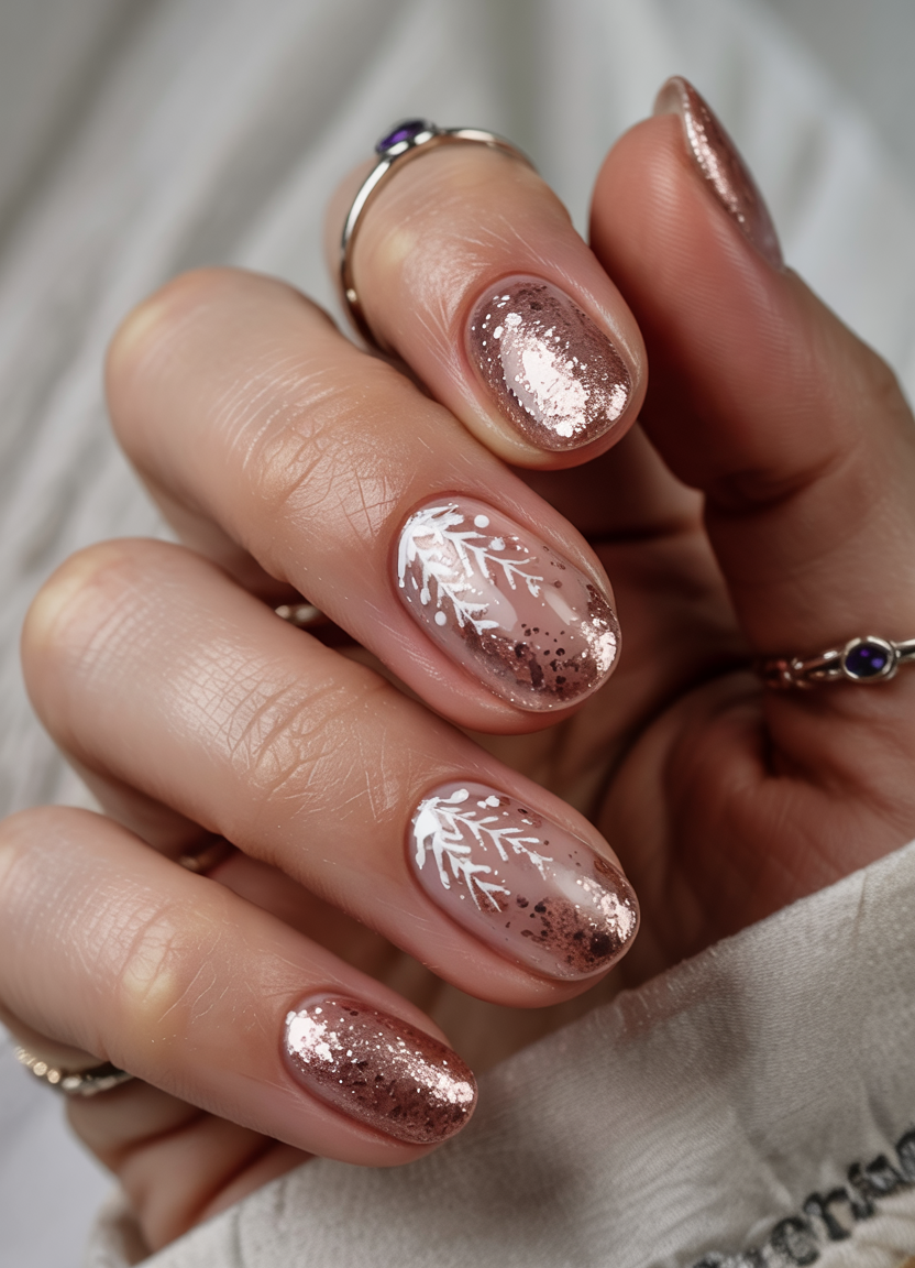 A manicure that looks like an ornament pulled straight from the Christmas tree—rose-toned glitter, soft pinks, and delicate white snowflakes dancing across each nail. This design has a sparkle that doesn’t just catch the light; it catches attention. It’s glamorous yet approachable, festive without being overwhelming.