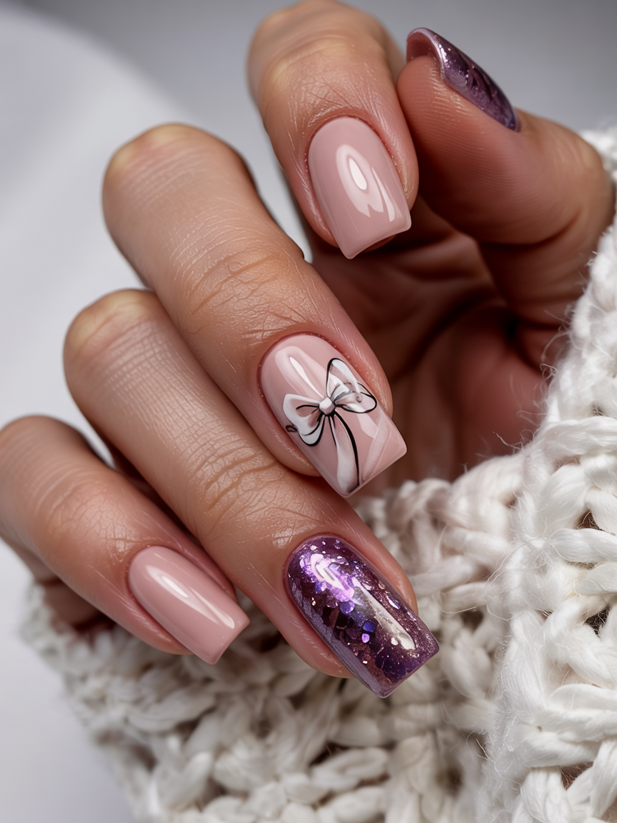 There is a playfully charming, almost gift-wrapped quality to this manicure. The blush pink nails are cute by themselves, yet the black-and-white bow art feels like the final adornment on a gorgeously wrapped present. Cast in purple glitter accents, and those nails are practically singing a Christmas carol for you.
