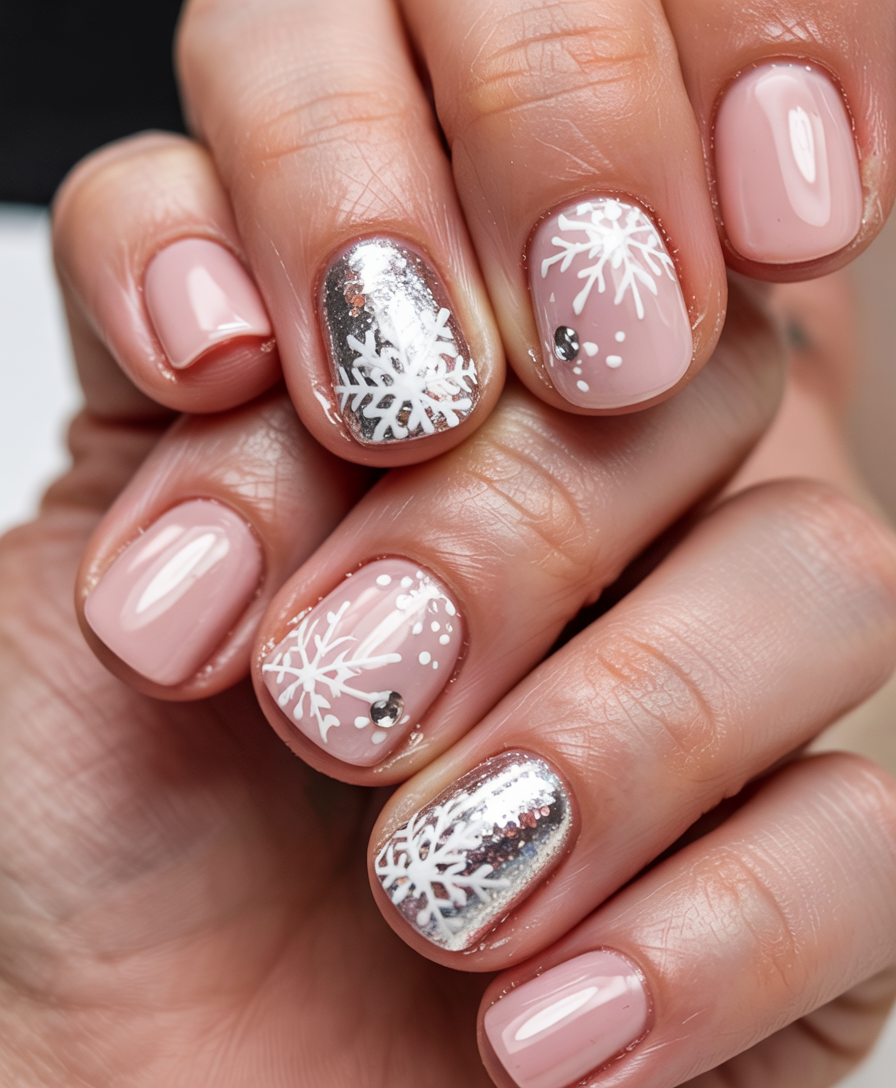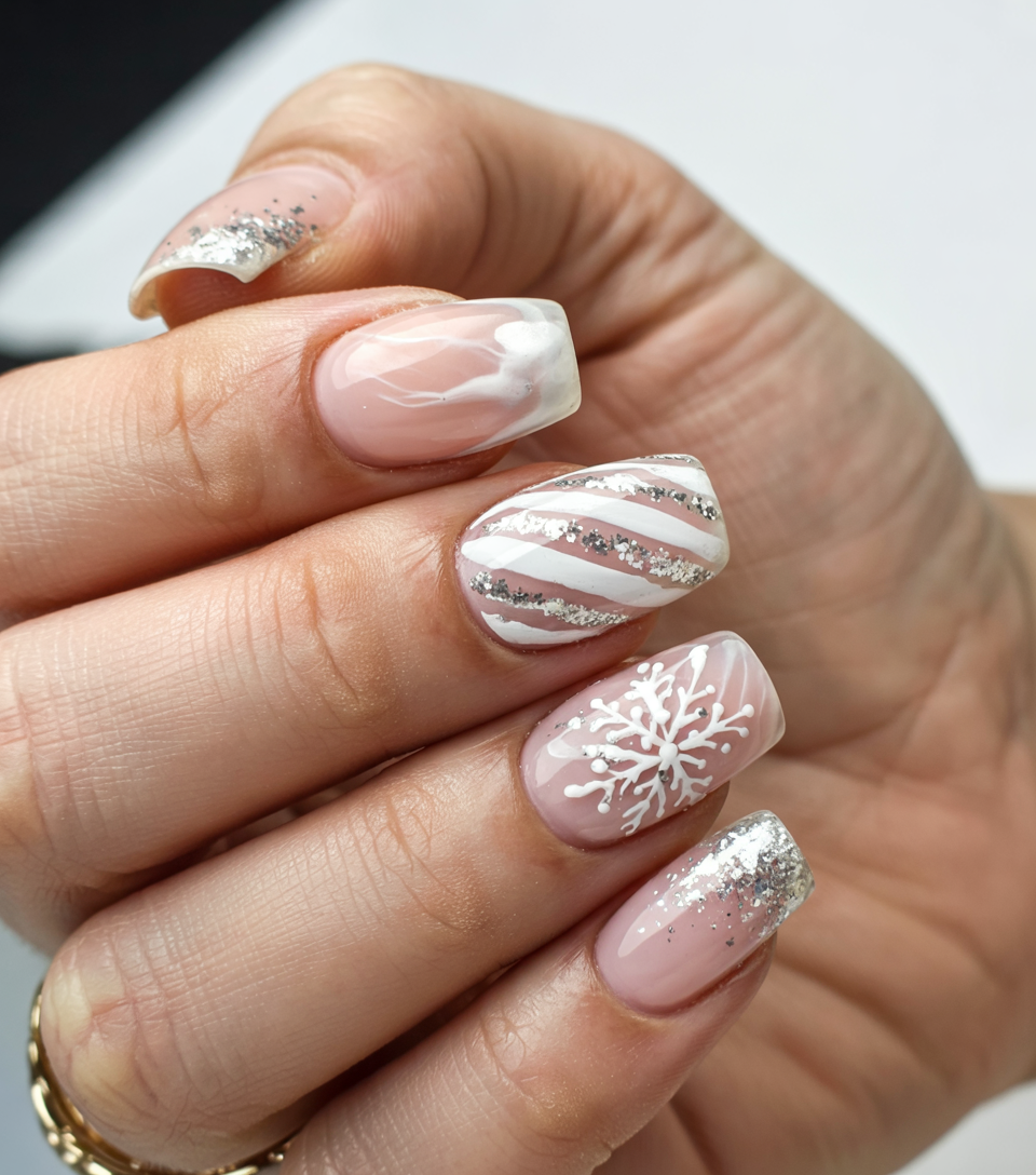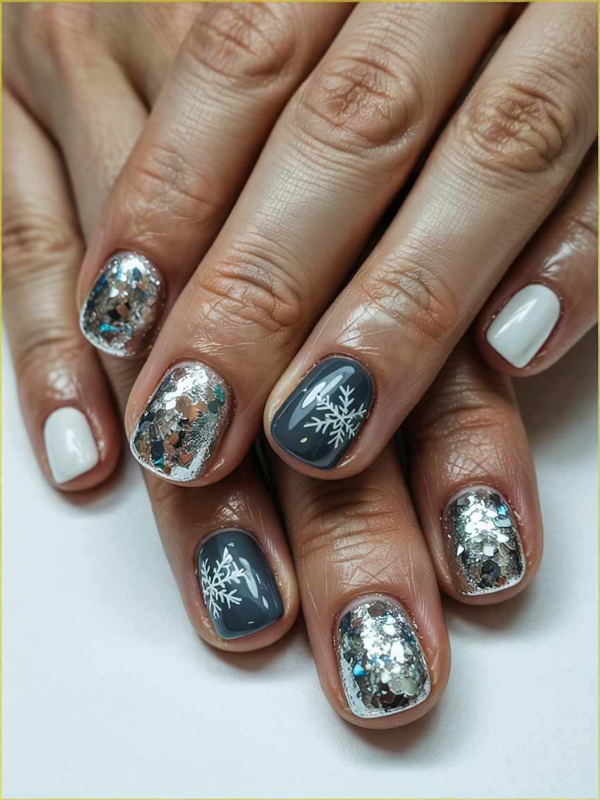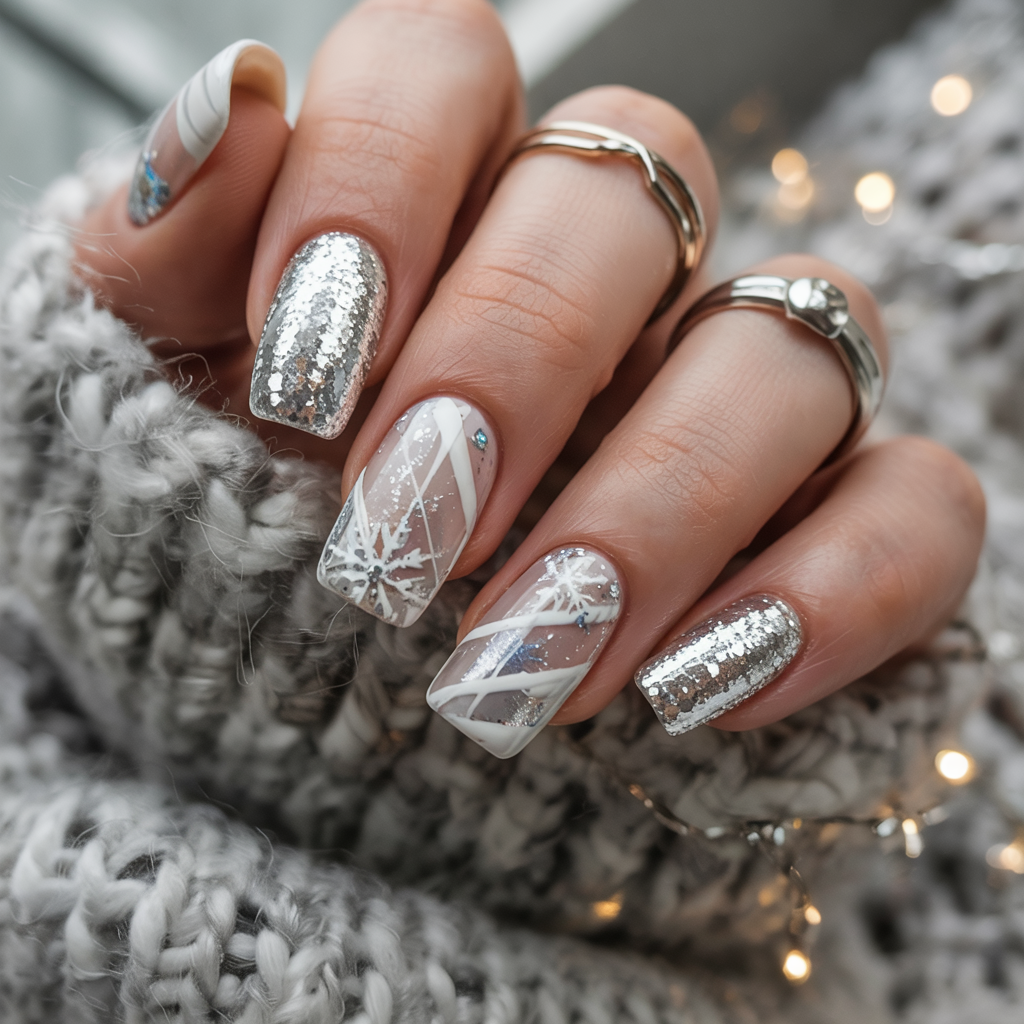 This one is nothing but winter glamour with silver sequins and snowflake accents. The design goes a step further by mixing glittery chrome nails and detailed snowflake art on a neutral base that spells out frost and festival at one go. It is like wearing holiday lights on your fingertips.